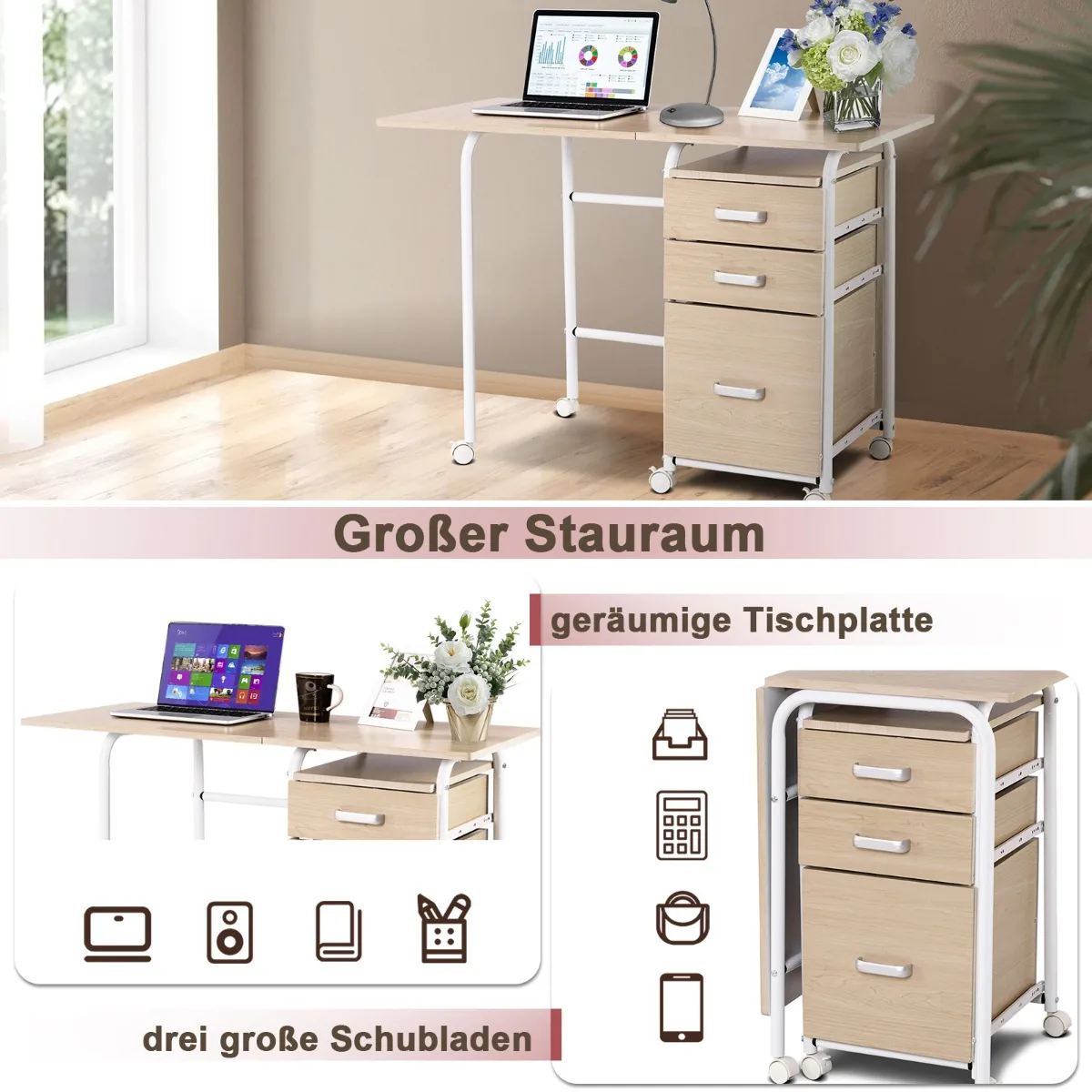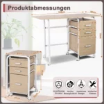 - Stalas turi tris stalčius skirtingo aukščio, tinkamus raštinės reikmenims, dokumentams ir elektronikai laikyti.