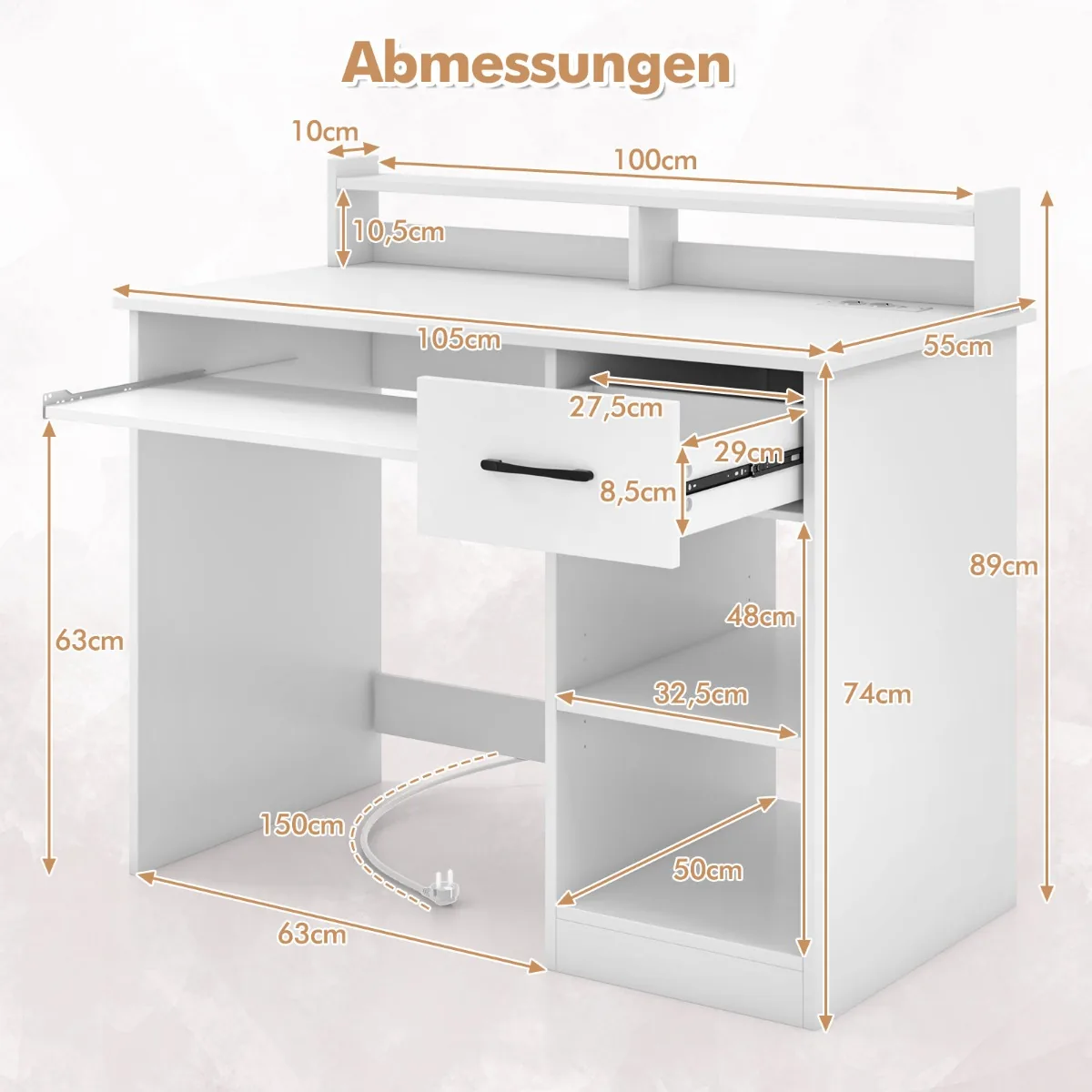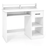 Rašomasis stalas 105x55x89 cm baltos spalvos – funkcionalus sprendimas namų ar biuro darbo vietai. Šis kompiuterio stalas pasižymi patogiu stalviršiu ir integruotomis elektros jungtimis, leidžiančiomis patogiai prijungti įvairius įrenginius.