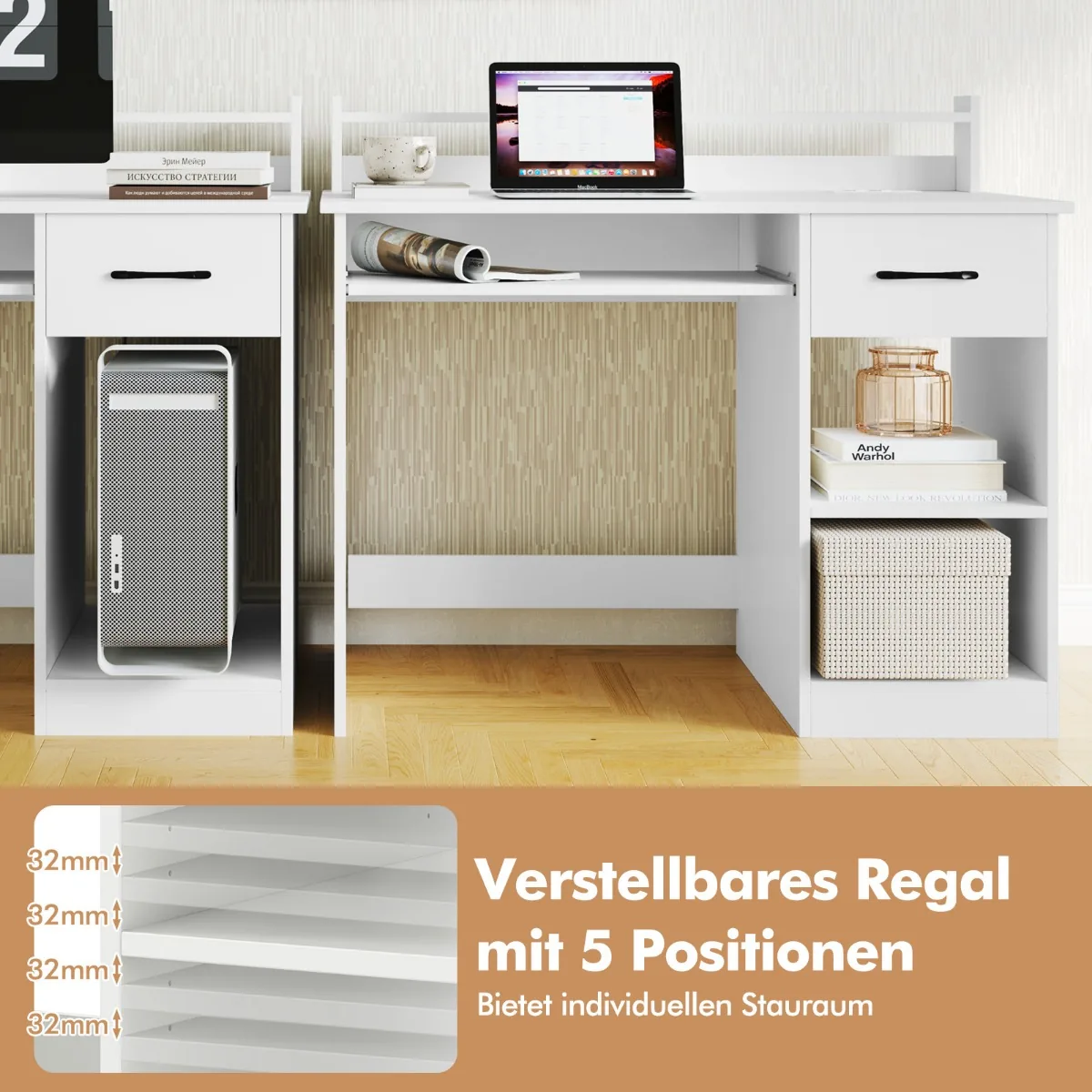 - Ištraukiamas klaviatūros dėklas ir papildomos saugojimo galimybės su stalčiumi bei reguliuojamomis lentynomis.