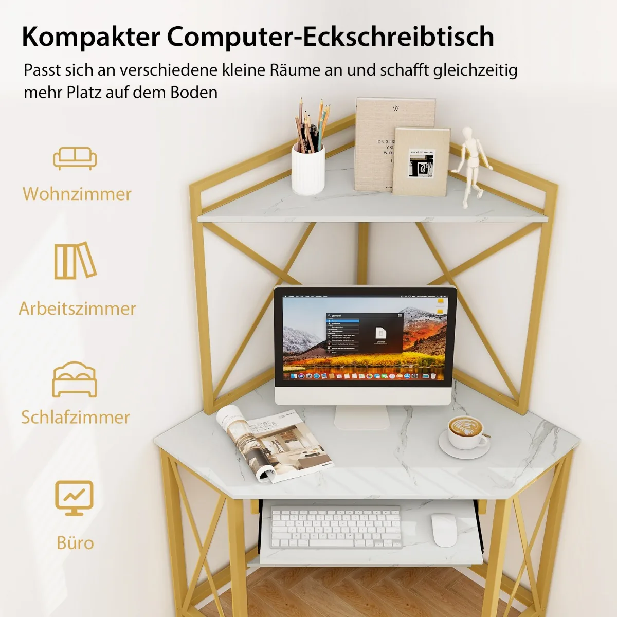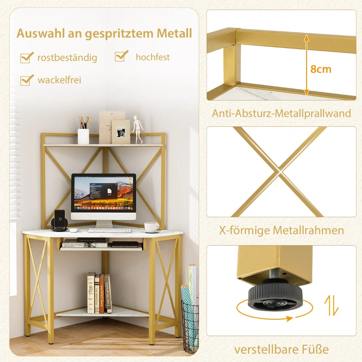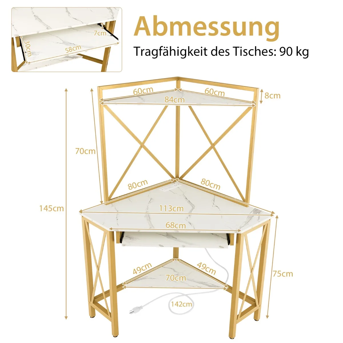 Rašomasis stalas 113x80x145cm baltos ir auksinės spalvos puikiai tinka kompaktiškai ir funkcionaliai darbo vietai kurti. Kampinis stalas sujungia rašomąjį stalą ir spintelę, todėl suteikia daugiau vietos darbo priemonėms bei įrenginiams. Jame integruota įkrovimo stotelė su USB prievadais ir kintamosios srovės lizdais, užtikrina patogų įrenginių maitinimą.