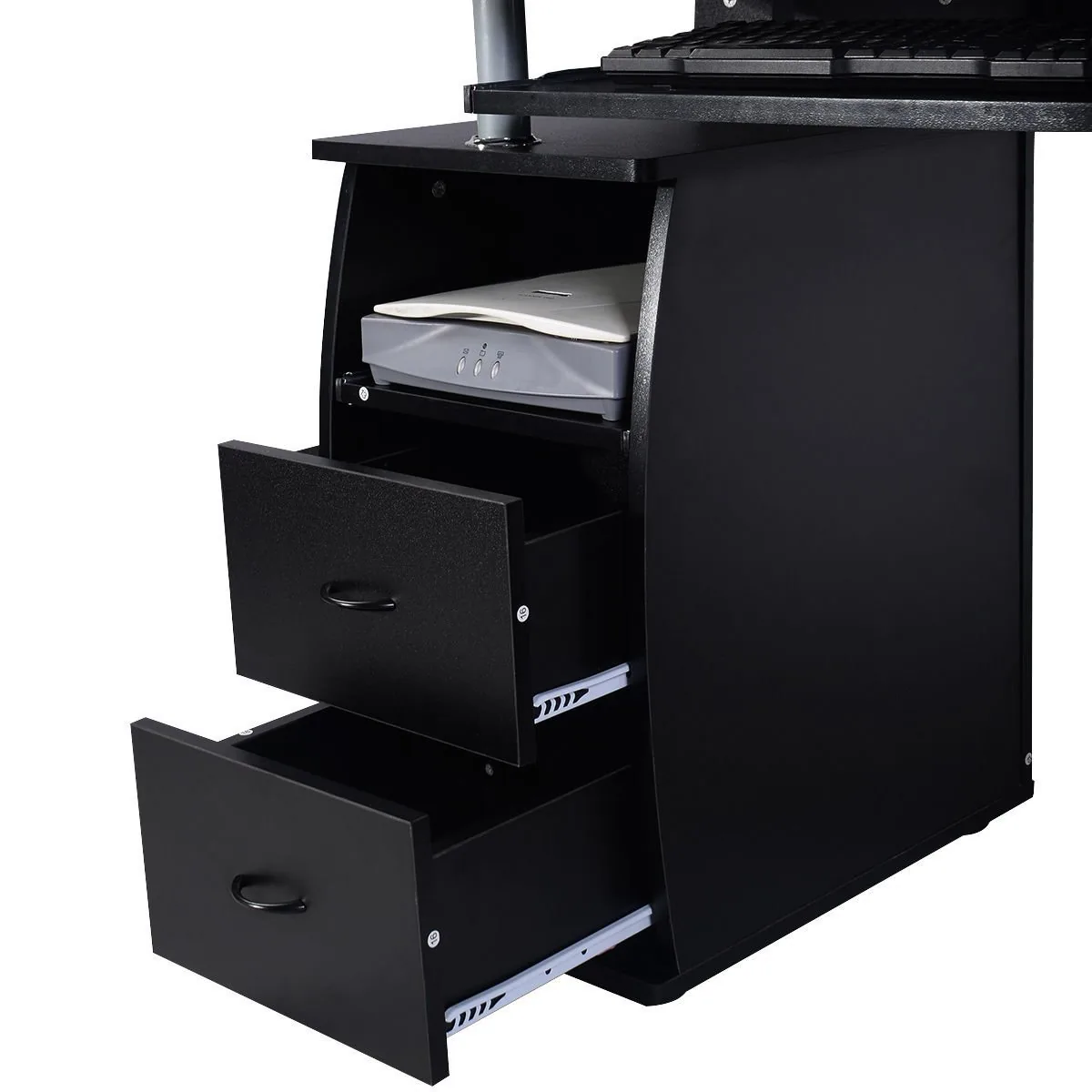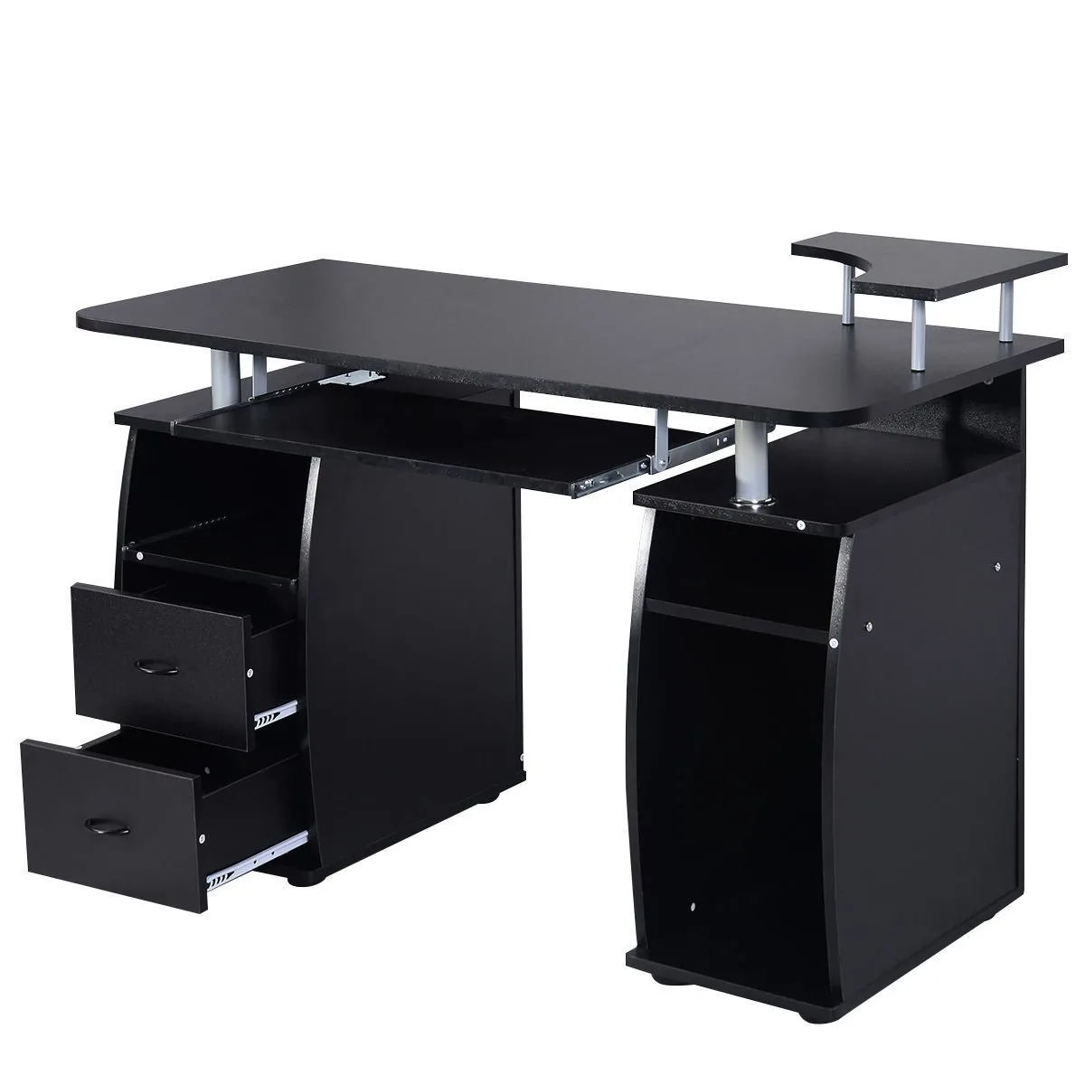 Rašomasis stalas 120x55x85cm., juodos spalvos, puikiai tinka darbo ar mokymosi erdvei. Kompaktiški matmenys leidžia optimaliai išnaudoti vietą, o juoda spalva dera prie įvairaus interjero. Stalas užtikrina patogią darbo vietą su papildomomis lentynėlėmis klaviatūrai ir spausdintuvui.