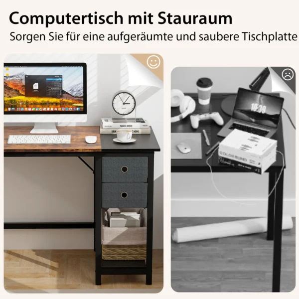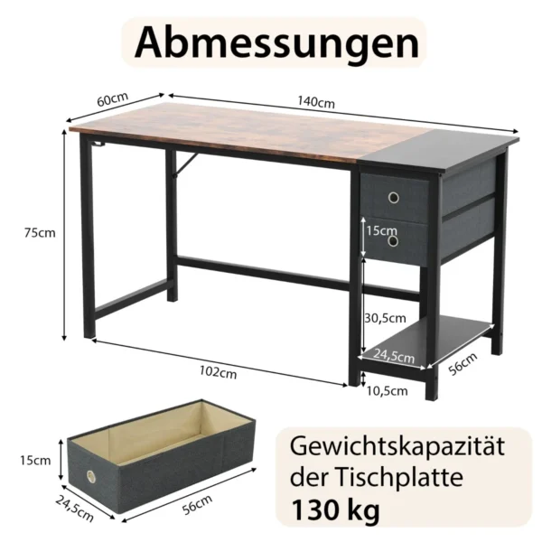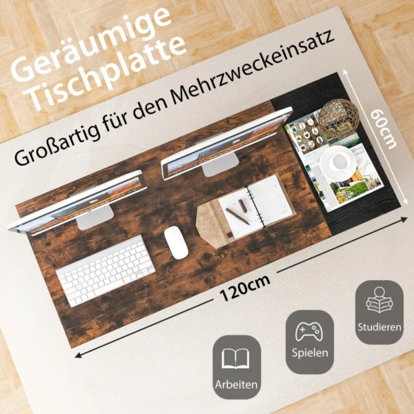 Rašomasis stalas 120x60x75cm, rudos ir juodos spalvos, skirtas namų biurui ar žaidimų erdvei. Šis kompiuterio stalas pasižymi patogia saugykla ir tvirta konstrukcija, užtikrinančia ilgaamžiškumą bei stabilumą. Dėl funkcionalaus dizaino ir dviejų erdvių stalčių jis padeda palaikyti tvarką darbo vietoje.