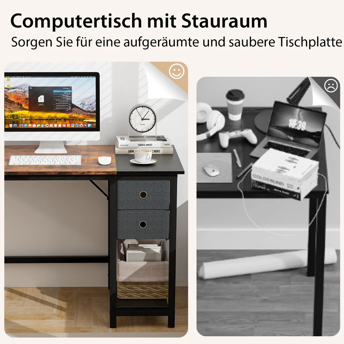 - Dviejų stalčių ir apatinės lentynos sistema leidžia tvarkingai laikyti biuro reikmenis ir techniką.