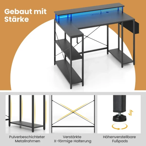 Rašomasis stalas 120x80x87cm juodos spalvos yra funkcionalus baldų sprendimas tiek darbui, tiek žaidimams. L formos konstrukcija užtikrina pakankamai vietos kompiuteriui ir biuro reikmenims, o integruota LED apšvietimo sistema sukuria patogią darbo aplinką.