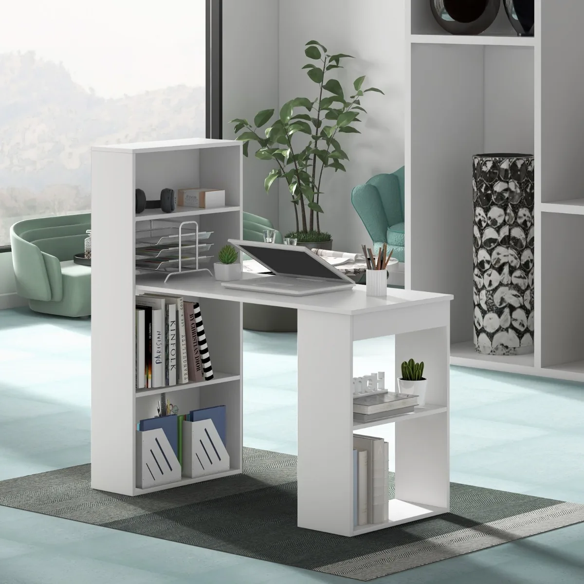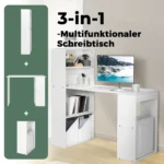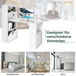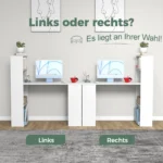 Rašomasis stalas 122x56x122 cm baltos spalvos yra funkcionali darbo vieta namams ar biurui. Šis stalas su integruota knygų lentyna suteikia pakankamai vietos kompiuteriui, knygoms ir smulkiems daiktams laikyti. Galimybė pasirinkti lentynos poziciją kairėje arba dešinėje padeda pritaikyti baldą prie įvairių patalpų išplanavimų.
