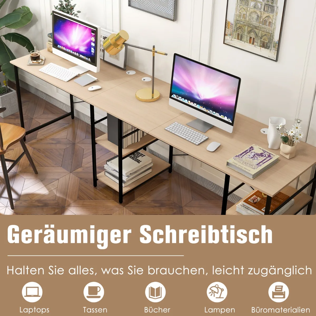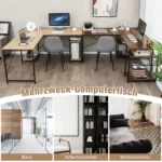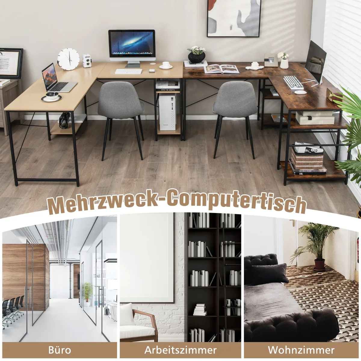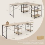 Rašomasis stalas 151x151x75 cm šviesiai rudos ir juodos spalvų derinyje yra funkcionalus sprendimas namų biurui. Dėl dviejų surinkimo būdų galite pasirinkti L formos kampinį stalą arba ilgesnį rašomąjį stalą dviem žmogaus. Didelė darbo zona ir papildomos lentynos užtikrina patogų darbo vietos organizavimą.