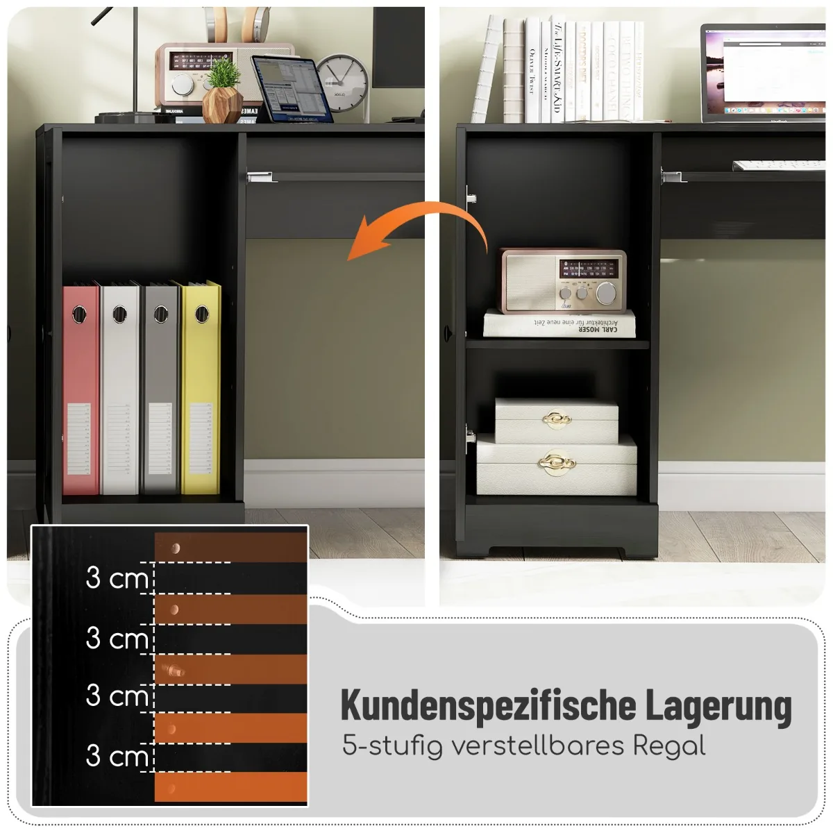 - Spintelė su penkių padėčių reguliuojama lentyna bei du stalčiai suteikia papildomą saugojimo funkcionalumą.