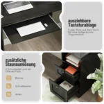 Rašomasis stalas 168x168x76cm juodos spalvos – didelis ir erdvus L formos kampinis darbo stalas, skirtas efektyviam darbui, žaidimams ar kūrybinei veiklai namų biure. Stalas pasižymi integruota įkrovimo stotele ir įvairiomis saugojimo galimybėmis, užtikrinančiomis tvarką ir patogumą.