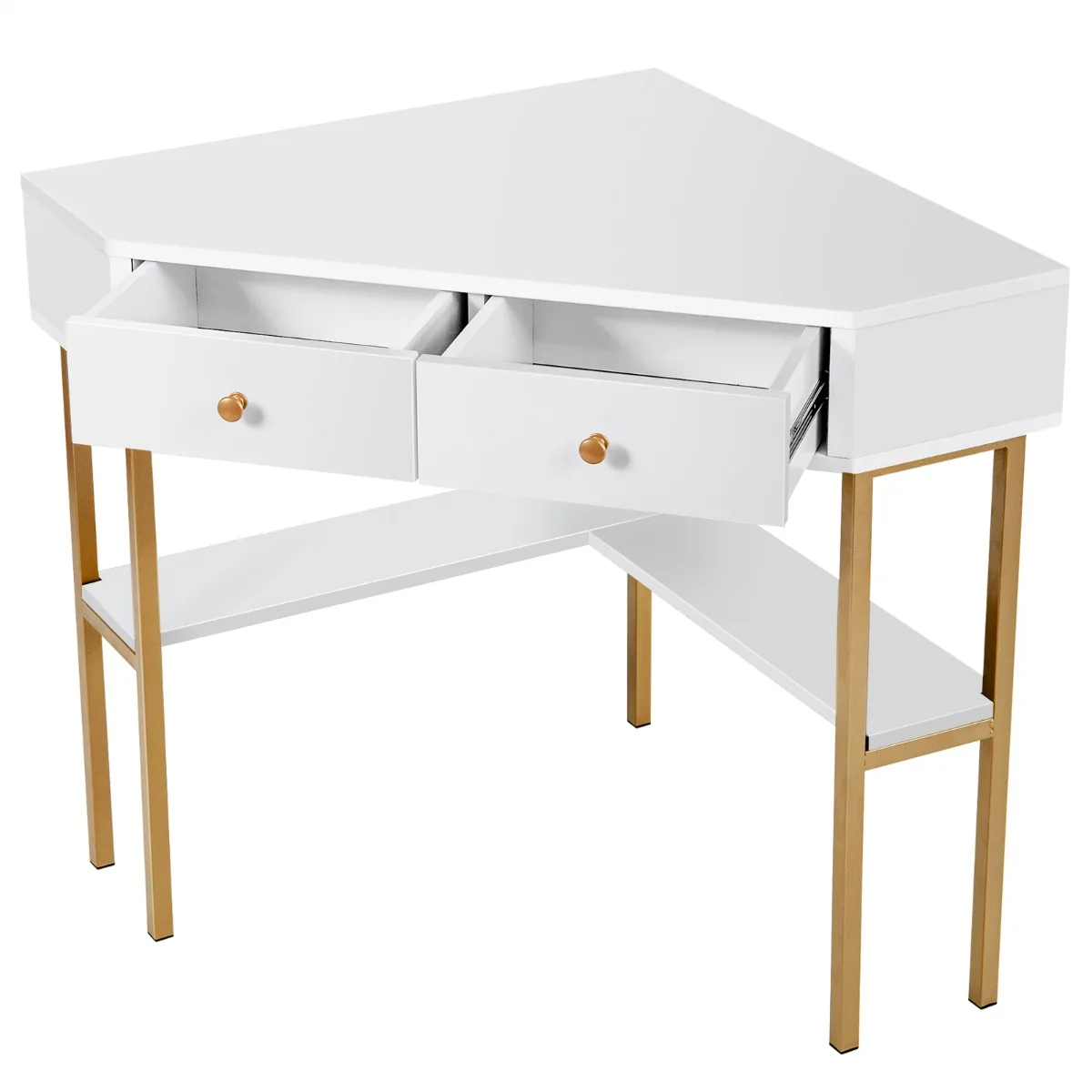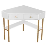 Rašomasis stalas 70,5×70,5×75 cm baltos ir auksinės spalvos puikiai tinka mažoms erdvėms, kur svarbu maksimaliai išnaudoti kampines zonas. Stalas turi du stalčius ir kelias lentynas, suteikiančias pakankamai vietos darbo ar mokymosi reikmenims laikyti. Jo tvirta konstrukcija ir stabilios plieninės kojos užtikrina patikimą naudojimą kasdien.