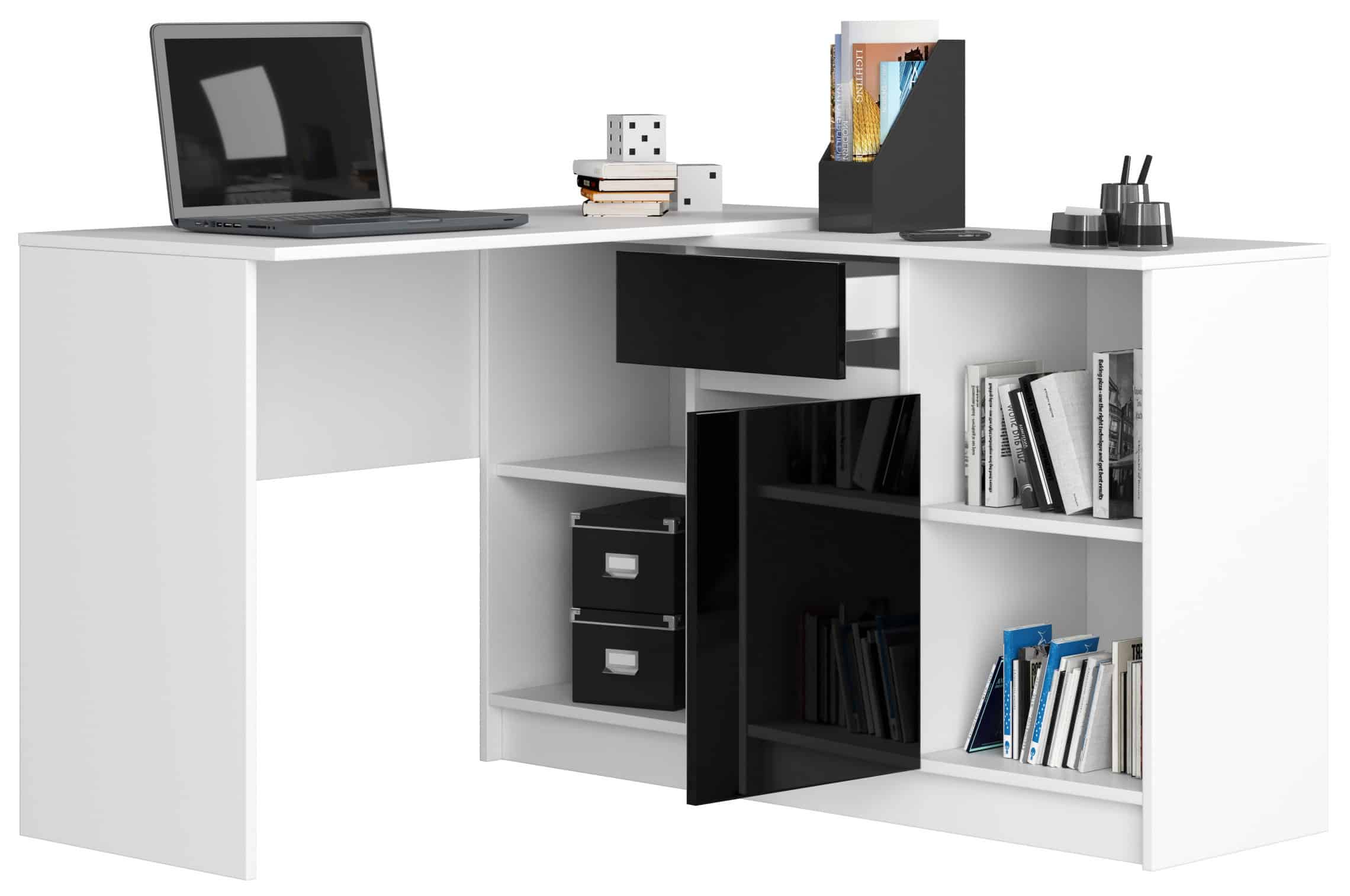Rinkinys B-17 yra įdomaus dizaino rašomasis stalas kartu su komoda. Modernūs, minimalistiniai baldai sujungia dvi nesenstančias spalvas, kurios fantastiškai dera su visomis kitomis spalvomis – juoda ir balta. Dėl solidžios baldų konstrukcijos jie itin populiarūs tarp žmonių, ieškančių kokybiškų funkcionalių sprendimų. Rašomasis stalas ir komoda kruopščiai pagaminti iš patvarių medžiagų. Rinkinys pagamintas iš 16 mm storio laminuotos plokštės (prekės ženklas „Kronospan”) ; Balduose yra daug vietos bet kokiam išdėstymui; Stalčiai eina ant metalinių ritinėlių kreiptuvų; Matomi kraštai padengti ABS apvadu, kuris garantuoja didesnį atsparumą pažeidimams; li> Rinkinys universalus, leidžia sukurti dešinės ir kairės pusės derinį; Rašomasis stalas ir komoda skirta montuoti savarankiškai; Instrukcija yra komplekte; Gaminio garantija yra 24 mėnesiai. Elegantiškas ir funkcionalus, jis bus naudojamas ypač mažose patalpose, kur svarbu naudoti kiekvieną kvadratinis metras. Pristatoma prekė leis susidėti visas patogias kanceliarines prekes, taip pat dokumentus, segtuvus, knygas ir daug kitų dalykų. Baldą sudaro kampinis stalviršis, stalčius, taip pat uždaros ir atviros spintos. Jis puikiai tiks biuruose, taip pat namų biuruose, vaikų ir paauglių kambariuose.