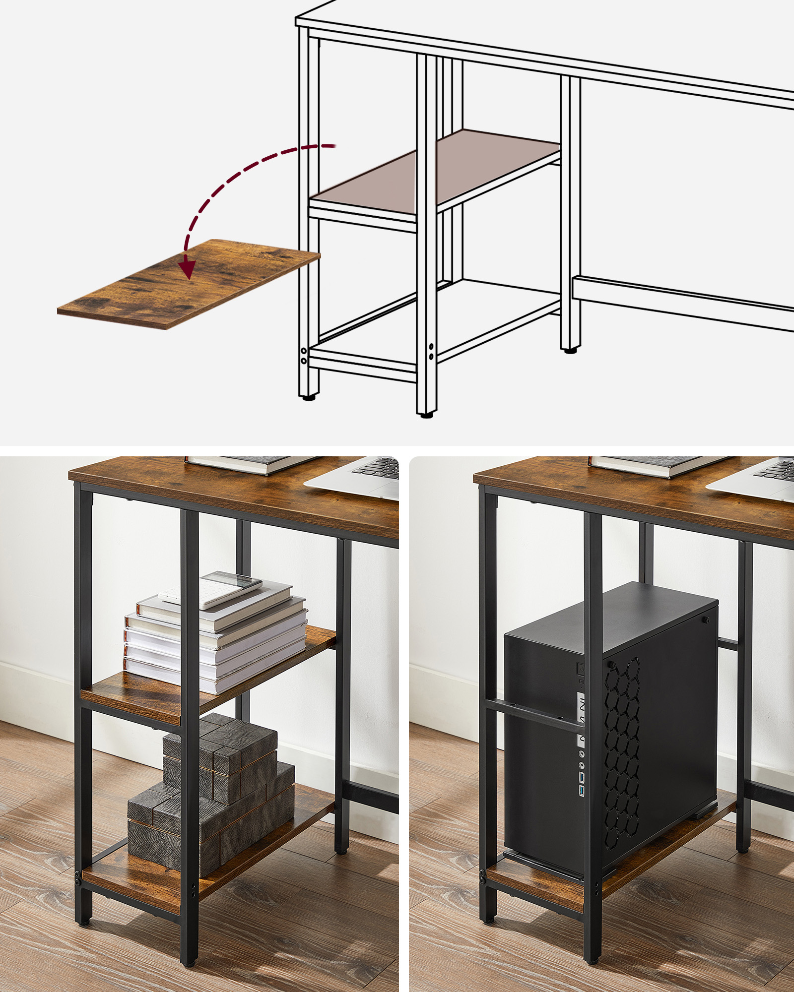 Šis stalas ne tik puikiai atrodo, bet ir yra itin patvarus, pagamintas iš aukštos kokybės medžiagų. Plieninė konstrukcija užtikrina stabilumą, o medžio drožlių plokštė suteikia natūralų ir šiltą pojūtį. Lentynos leidžia patogiai laikyti knygas, dokumentus ar kitus reikalingus daiktus, todėl jūsų darbo vieta visada bus tvarkinga ir organizuota.
