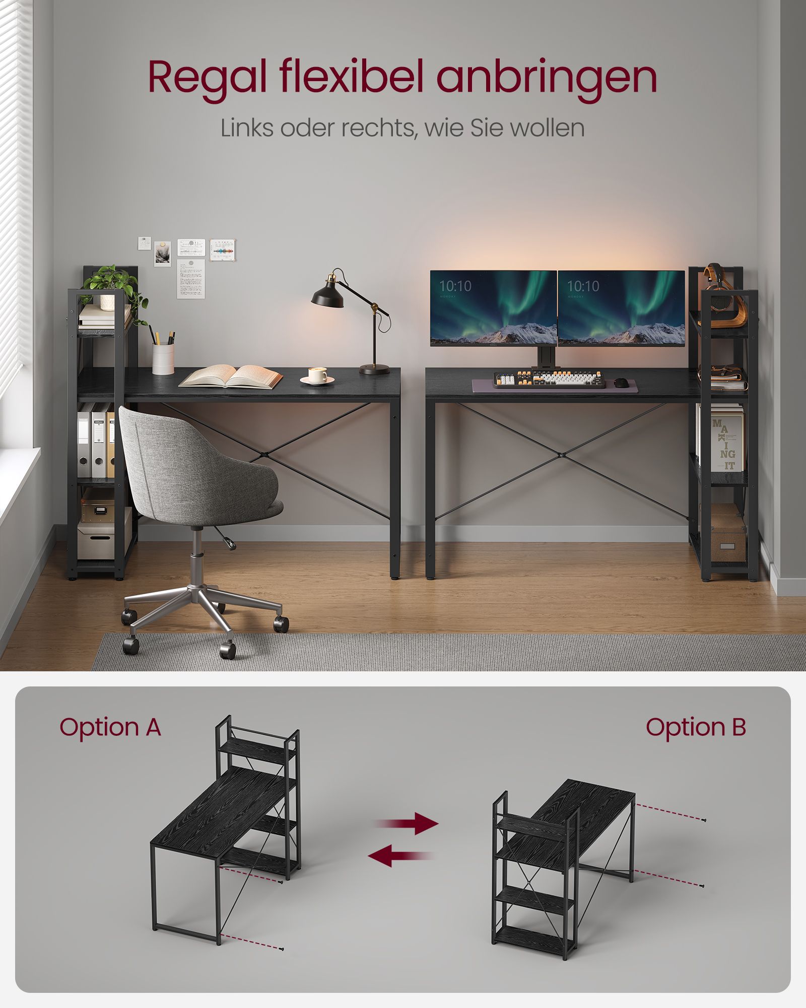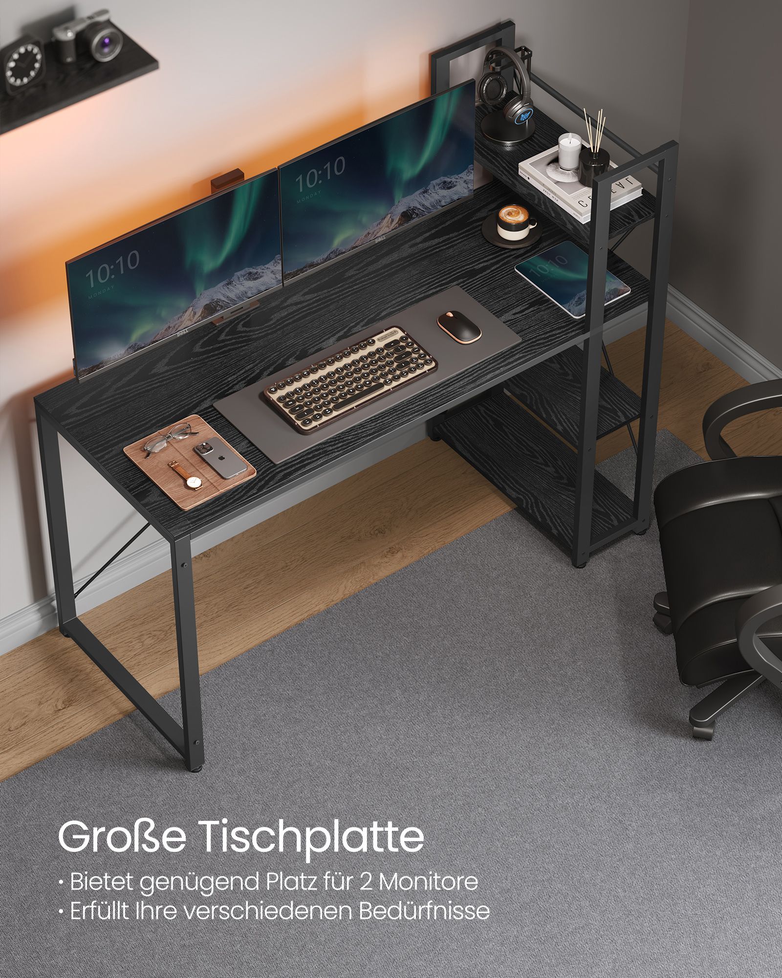 Šis elegantiškas ir funkcionalus rašomasis stalas su lentynomis yra puikus pasirinkimas tiek namų biurui, tiek darbo vietai. Jo modernus dizainas ir juodmedžio juoda spalva suteikia prabangos ir stiliaus bet kuriai erdvei.