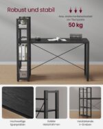 Šis stalas ne tik suteikia pakankamai vietos darbui, bet ir turi integruotas lentynas, kurios padės tvarkingai laikyti knygas, dokumentus ar kitus reikmenis. Tvirtas plieninis rėmas užtikrina stabilumą ir ilgaamžiškumą, o kokybiška medžio drožlių plokštė suteikia elegantišką išvaizdą.