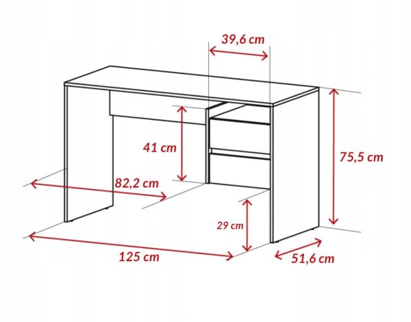 Stalo išmatavimai: ilgis – 125 cm, aukštis – 75,5 cm, gylis – 51,6 cm;