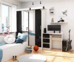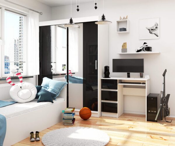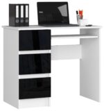 Puikus stalas nešiojamam kompiuteriui ar kompiuteriui turėtų užtikrinti taisyklingą kūno laikyseną net ir per daug darbo valandų. Naudojimosi patogumas yra nepaprastai svarbus – tiek vaikams, tiek paaugliams, tiek suaugusiems. Pristatomas modelis A-6 90 cm. (kairėje) – tai darbo patogumą, funkcionalumą, solidų apdirbimą ir estetinę išvaizdą apjungiantis rašomasis stalas, kuris neabejotinai patenkins visus minimalizmo ir modernaus interjero mylėtojus. Balduose dera, baltas korpusas ir juodi blizgūs fasadai. Toks derinys neabejotinai sudomins kiekvieną paauglį, suteiks jam tinkamą vietą mokymuisi ir pramogoms. Pristatomas baldas pagamintas iš laminuotos atsparios plokštės. Atsparus trinčiai; Rašomasis stalas turi daug vietos bet kokiam išdėstymui; Stalčių fasadai pagaminti iš aukštos kokybės laminuotos plokštės; > Stalčiai ir klaviatūros lentyna juda ant metalinių ritinėlių kreiptuvų; Matomi kraštai yra padengti ABS kraštų juostele, užtikrinančia didesnį atsparumą pažeidimams; Rašomasis stalas yra baldas, skirtas montuoti savarankiškai; Instrukcija pridedama prie komplekto; Prekės garantija yra 24 mėnesiai. Stalą sudaro trys praktiški stalčiai ir klaviatūros lentyna. Nespalvotą baldą galima laisvai derinti su kitais tos pačios serijos pasiūlymais, pavyzdžiui, komodomis, spintomis ar lentynomis, taip sukuriant vientisą, modernių atspalvių erdvę.