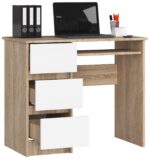Nedidelis ir tvarkingas kompiuterio stalas A-6,, ąžuolo spalvos ąžuolo spalvos, yra puikus pasirinkimas jaunimui ir modernaus interjero mėgėjams. Jis pristato save maloniai ir atitinka šiuolaikines tendencijas. Baldai, telpantys praktiškai bet kurioje, net mažiausioje patalpoje, taip pat yra efektyvūs darbe. 90 cm x 50 cm stalviršyje užteks vietos mokyklinėms reikmenims, vadovėliams ir nešiojamam kompiuteriui arba kompiuteriui. Spalvos: pagrindinė spalva čia yra sonomos ąžuolo spalva, harmoningai derinanti su baltais stalčių fasadais. Subtilus kontrastas tarp spalvų nedirgina akių, todėl kad stalo vartotojas galės be problemų sutelkti dėmesį į jūsų darbą. Interjeras: Rašomasis stalas turi 3 erdvius stalčius, suteikiančius daug erdvės tobulėjimui. Jie yra kairėje stalo pusėje. Po stalviršiu rasite specialią lentyną kompiuterio klaviatūrai, kuri, kaip ir stalčiai, juda ant metalinių ritinėlių kreiptuvų. Apdaila: Stalčių fasadai ir stalo rėmas sudarančios laminuotos lentos yra atsparios dilimui. Nuplauti juos taip pat lengva. Be to, matomi kraštai yra padengti specialiu ABS apvadu, kad būtų didesnis atsparumas pažeidimams. Dydžiai: – aukštis: 77 cm, – ilgis: 90 cm, – gylis: 50 cm. Rašomasis stalas A_6 sveria tik 30 kg, todėl jį bet kada galima perkelti iš vieno kampo į kitą. Jis skirtas surinkti savarankiškai ir lengvai surinkti, naudojant aiškias instrukcijas, pateiktas kartu su pristatymu. – Rašomasis stalas iš dilimui atsparios laminuotos plokštės – Yra daug vietos bet kokiam išdėstymui – Stalčių fasadai pagaminti iš laminuotos plokštės – Stalčiai ir klaviatūros lentyna juda ant metalinio volelio kreiptuvai – Matomi kraštai padengti ABS briauna, kad būtų didesnis atsparumas pažeidimams – Savaime surenkamas stalas – Pristatymo vadovas – Garantija 24 mėn.