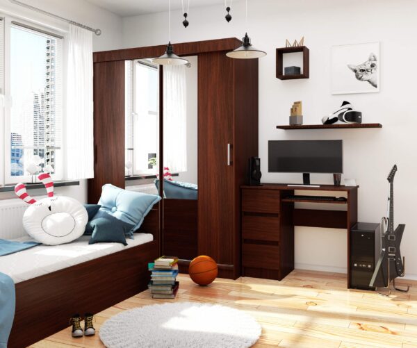 Pristatome jums paprastą ir itin funkcionalų kompiuterio stalą A-6 (kairėje), sukurtą madingos ir nesenstančios, tamsiai rudas spalvos. Baldai pagaminti iš 16 milimetrų storio laminuotos plokštės, kuri pasižymi puikiu atsparumu dilimui. Matomos briaunos padengtos padidinto stiprumo ABS briauna, į kurią taip pat reikėtų atsižvelgti. Dėl to gaminys puikiai tinka ne tik namų biurui, bet ir biurui, kuriame dirba daug žmonių. Rašomasis stalas iš CLP sistemos gali būti praturtintas daugybe kitų įdomių pasiūlymų, atitinkančių pasirinktos kompozicijos stilių. Rašomasis stalas susideda iš trijų erdvių stalčių, erdvaus viršaus ir ištraukiamos lentynos. Balduose, kuriuos mielai pristatome, yra daug vietos bet kokiam išdėstymui. Stalčiai ir klaviatūros lentyna juda ant metalinių ritinėlių kreiptuvų. Gaminys skirtas montuoti savarankiškai, pridedamas vadovas. Stalui suteikiama 24 mėnesių garantija. Rašomasis stalas yra neatsiejamas kiekvienas biuro interjeras, kuriame galima dirbti ramiai, tvarkingai. Tikimės, kad mūsų parengtas pasiūlymas patiks mūsų klientams, vertinantiems funkcionalumą ir universalų dizainą. Madingą, tamsiai rudas spalvą tikrai įvertins žmonės, norintys sukurti ne tik praktišką, bet ir vizualiai patrauklų interjerą. Taip pat raginame susipažinti su kitais mūsų internetinės parduotuvės pasiūlymais. – stalas pagamintas iš dilimui atspari laminuota lenta – Yra daug vietos bet kokiam išdėstymui – Stalčių fasadai pagaminti iš laminuotos plokštės – Stalčiai ir klaviatūros lentyna yra ant metalinių ritinėlių kreiptuvų – Matomi kraštai padengtas ABS briauna garantuoja didesnį atsparumą pažeidimams – „Pasidaryk pats” stalas – Pridedamos instrukcijos – Garantija 24 mėn.
