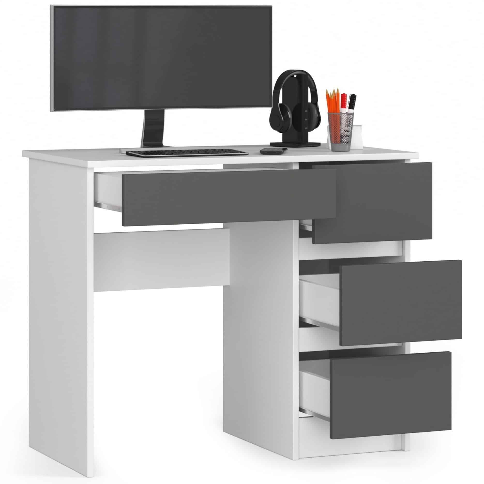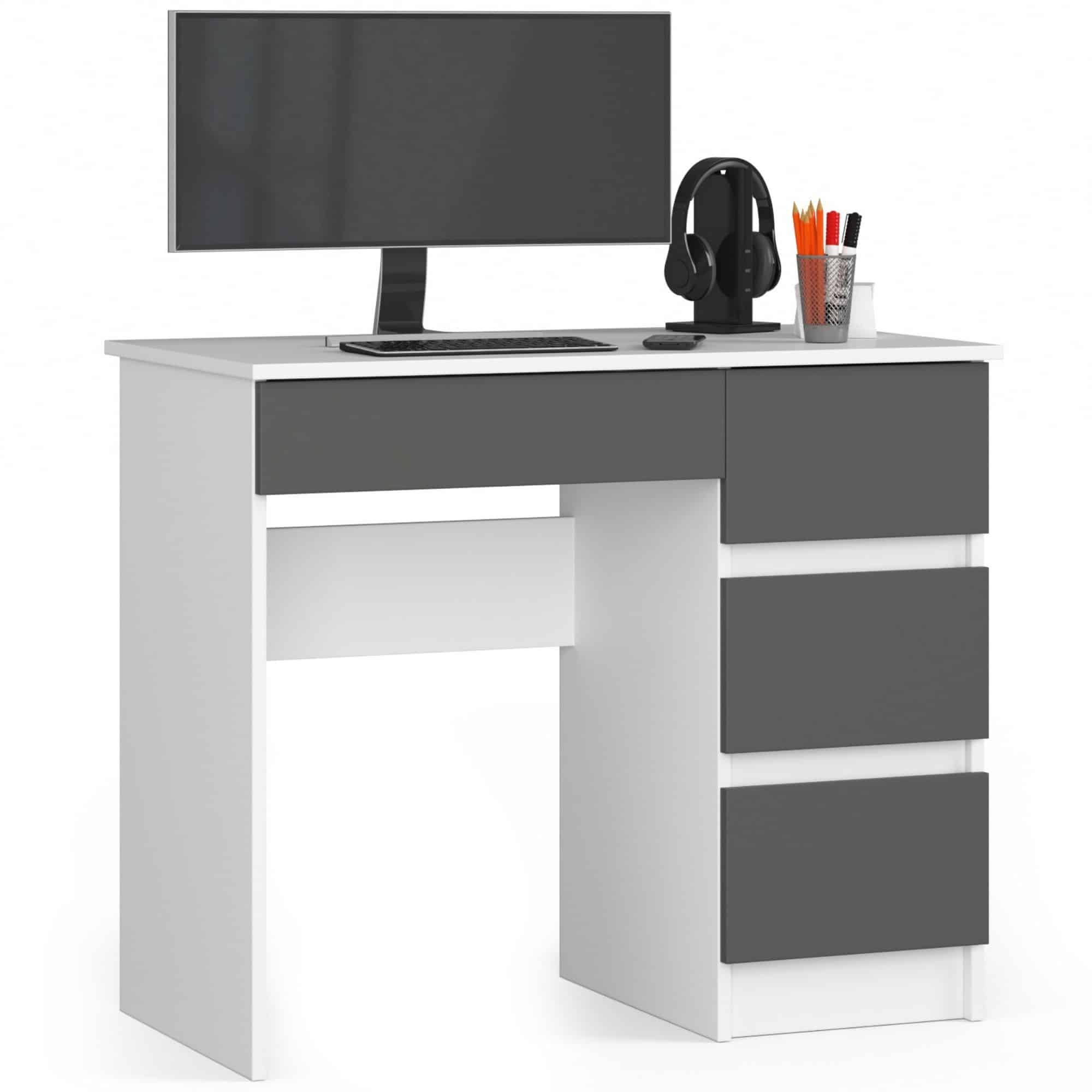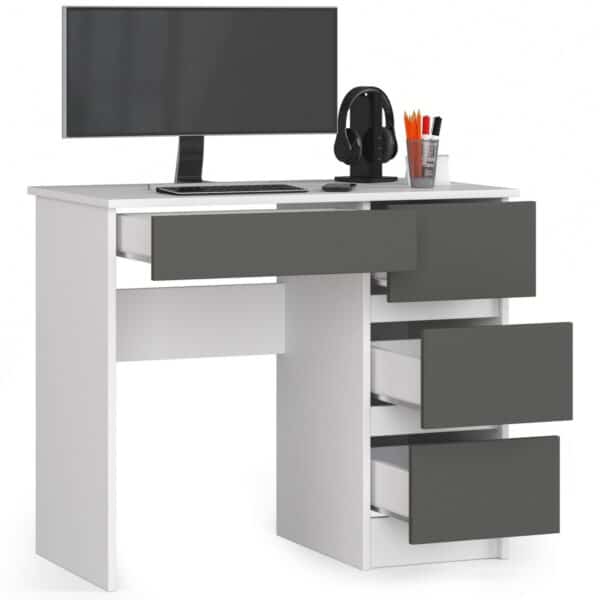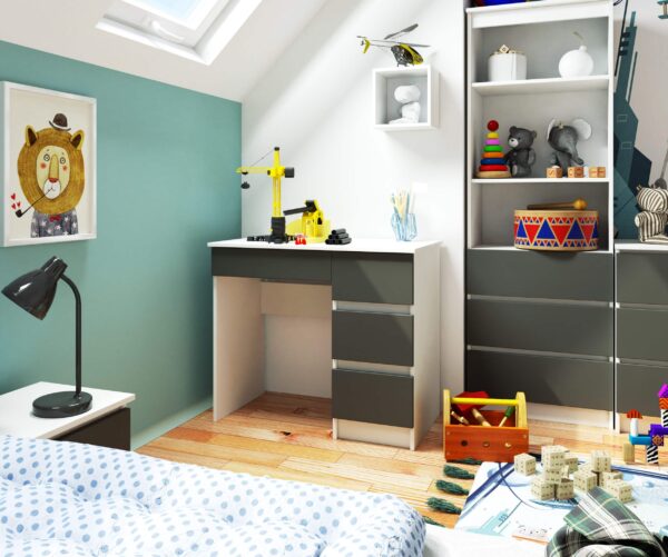 Kompiuterio stalas A-7 yra nedidelis baldas, kurį galima naudoti mažoje patalpoje – biure ar svetainėje. Jis veiks, pavyzdžiui, namų biure arba vaikų / jaunimo kambaryje. Pristatytame gaminyje dera dvi kontrastingos, bet puikiai viena kitą papildančios spalvos – pilka grafitinė ir balta. Jį sudaro trys stalčiai bet kokiam išdėstymui. Paprastas savo forma, bet itin funkcionalus, šį baldą tikrai įvertins žmonės, norintys sukurti kampelį darbui ar studijoms, tačiau neturintys daug vietos. Gaminys pagamintas iš dilimui atsparios laminuotos plokštės; Turi daug vietos bet kokiam išdėstymui; Stalčių fasadai yra pagaminti iš geros kokybės laminuotos plokštės; Stalčiai, kuriuose yra įrengti baldai, juda ant metalinių ritinėlių kreiptuvų; Matomi kraštai, padengti ABS apvadu, užtikrina didesnį atsparumą pažeidimams; Rašomasis stalas yra baldas, skirtas montuoti savarankiškai; Montavimo instrukcijos pridedamos; Gaminio garantija yra 24 mėnesiai. ul> Ant stalo galite įdėti kitus įrangos elementus, pvz. kaip knygų spinta, spinta ar rašomasis stalas, kurių dėka bus galima sukurti funkcionalų, nesenstantį kambarį vaikui, jaunimui ar namų biurui. Kolekcijos balduose dera tvirta struktūra, universalus dizainas, meistriškumas, dėmesys detalėms ir paprastas kasdienis naudojimas.