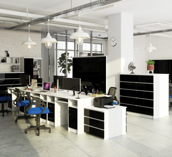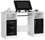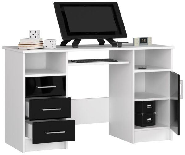 Siūlome baltą Ana kompiuterio stalą su blizgiais juodais priekiais. Rašomasis stalas susideda iš trijų erdvių stalčių, stumdomos klaviatūros lentynos ir šoninės spintelės, kurios viduje papildomai yra viena lentyna. Stalčiai ir durys turi sidabrines rankenas. Korpusas ir fasadai pagaminti iš patvarios 16 mm storio laminuotos plokštės. Be to, viršus, šonai ir priekiai padengti ABS apvadu, kuris yra atsparesnis trinčiai ir įvairiems mechaniniams pažeidimams. Stalčiai ir klaviatūros lentyna juda ant metalinių ritinėlių kreiptuvų, prireikus juos galima lengvai išimti ir išvalyti. Rašomasis stalas yra skandinaviško stiliaus, moderniai ir minimalistiškai atrodantis, idealiai tinkantis biure, vaikų kambaryje ar jaunimo kambaryje. Universalios spalvos ir paprastas dizainas puikiai tinka bet kokiam interjerui ir lengvai derinamas su kitais panašių spalvų baldais į komplektą. Didelis stalviršis tinka monitoriui, lempai ir kitiems priedams. Rašomasis stalas yra 124 cm ilgio, 74 cm aukščio ir 52 cm gylio. Bendras svoris 45 kg.. Baldai parduodami pakuotėse, skirtose montuoti savarankiškai, kartu su detalia surinkimo instrukcija. Gamintojas suteikia 24 mėnesių garantiją. – Rašomasis stalas iš dilimui atsparios laminuotos plokštės – Yra daug vietos bet kokiam išdėstymui – Viduje yra viena lentyna durys – Stalčių ir durų fasadai pagaminti iš blizgios juodos laminuotos plokštės – Stalčiai ir klaviatūros lentyna yra ant metalinių ritinėlių kreiptuvų – Stalviršis, šonai ir fasadai padengti ABS briauna – Sidabrinių stalčių ir durų rankenos – „Pasidaryk pats” rašomasis stalas – Pateikiamas vadovas – Garantija 24 mėn.