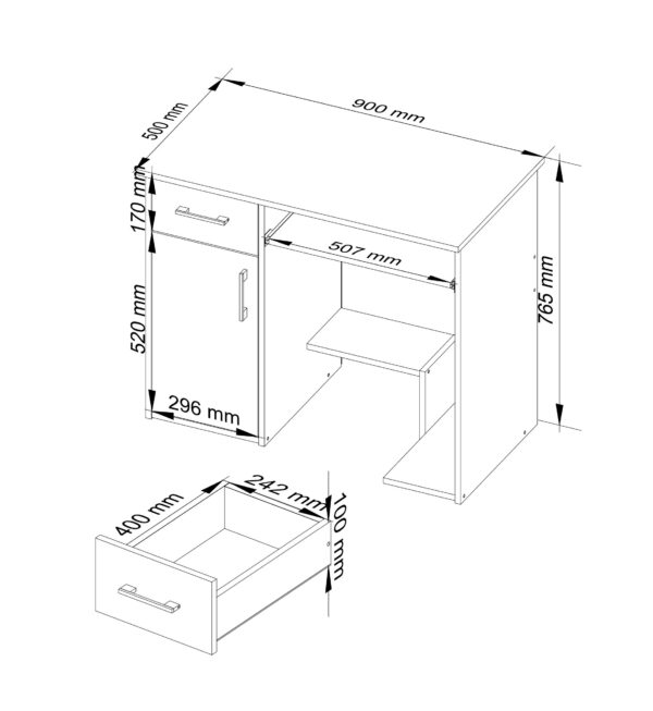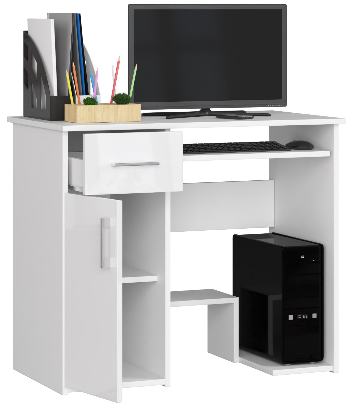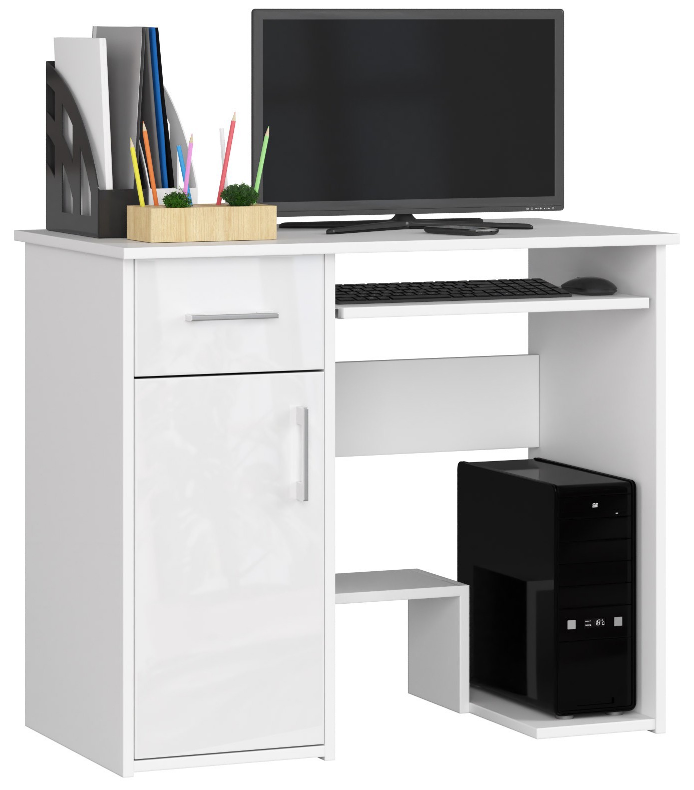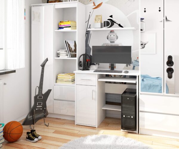 , baltas kompiuterio stalas buvo sukurtas žmonėms, kuriems namuose reikia vietos dirbti prie kompiuterio, tačiau jie turi mažai vietos. Šis mažas rašomasis stalas gali sutalpinti visus reikalingus biuro reikmenis, suteikiant vietą darbui, mokymuisi ir pramogoms. Baldai gali būti naudojami vaikų ar jaunimo kambaryje, taip pat biure. Jis nusipelno dėmesio dėl savo universalios išvaizdos ir puikios kokybės. Jo tvirtumo ir ilgaamžiškumo garantija – tvirta 16 milimetrų storio laminuotos plokštės konstrukcija. Gražus, kruopščiai išbaigtas madingos baltos spalvos rašomasis stalas itin vertinamas mūsų internetinėje parduotuvėje besilankančių klientų. Jeigu ieškote patogų darbą prie kompiuterio garantuojančio, apgalvotai pagaminto ir papildomai patrauklaus kainos atžvilgiu, mūsų pasiūlymas tikrai patiks ir teigiamai nustebins funkcionalumo ir aukštumo deriniu. kokybė. – Rašomasis stalas iš dilimui atsparios laminuotos plokštės – Turi daug vietos bet kokiam išdėstymui – Durelių viduje yra viena lentyna – Stalčių fasadai ir durelės pagaminti iš MDF 19 mm akrilo, itin blizgaus – Stalčiai ir klaviatūros lentyna yra ant metalinių ritinėlių kreiptuvų – Matomi kraštai padengti ABS briauna su padidintu atsparumu pažeidimams – Stalčių ir durų rankenos sidabrinės spalvos – Rašomasis stalas, skirtas savarankiškam surinkimui – Pridedamas vadovas – Gamintojo garantija 24 mėn.