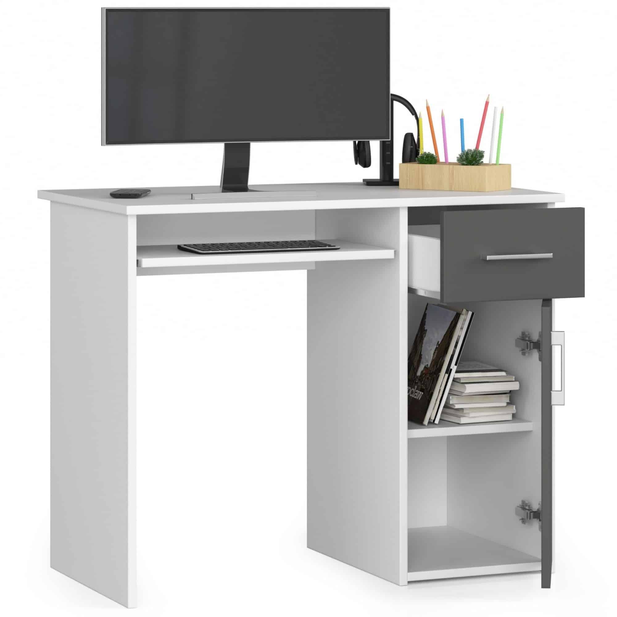 Praktiškas PIN kodo kompiuterio stalas yra skirtas tiek įmonių biurams, tiek privatiems namams. Baldo korpusas pagamintas iš atitinkamo storio laminuotos plokštės. Gaminys yra baltos spalvos, taip pat praturtintas grafito pilko atspalvio durų fasadais. Prie stalo dalių sumontuotos praktiškos metalinės ritinėlių kreiptuvų sistemos leidžia saugiai ir be strigčių naudoti gaminius. Siekiant apsaugoti aštrius baldo kraštus, buvo panaudotos specialios ABS briaunos, padidinančios jų atsparumą pažeidimams. Ant rašomojo stalo taip pat yra sidabrinės rankenos stalčiams ir durims, kurios suteikia jiems unikalumo. Gaminys gali stovėti ne tik prie sienos – dėl prie baldų pritvirtintos galinės plokštės jį galima pastatyti bet kurioje kambario vietoje. Baldai pristatomi dalimis, kartu su instrukcija ir gamintojo garantija. – Rašomasis stalas iš laminuotos plokštės, atsparios dilimui – Turi daug vietos bet kokiam išdėstymui – Durų viduje yra viena lentyna – Stalčių ir durų fasadai pagaminti iš laminuotos plokštės – Stalčiai ir klaviatūros lentyna yra ant metalinių ritinėlių kreiptuvų – Uždengti matomi kraštai su ABS briauna didesniam atsparumui pažeidimams – Rankenos stalčiams ir durims, sidabro spalvos – Rašomasis stalas, skirtas savarankiškai surinkti – Laisvai pastatomas stalas (laminuota lenta stalo gale) – Pristatymo instrukcija – 24 mėnesių garantija Laisvai pastatomas rašomasis stalas leidžia jį pastatyti biure, viešbutyje ar paslaugų patalpose. ABS briauna apsaugo stalo kraštus nuo pažeidimų. Puikus kainos ir kokybės santykis.