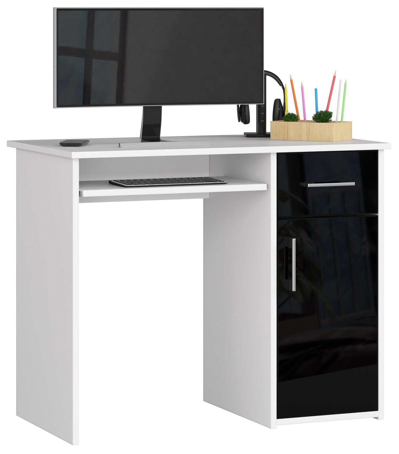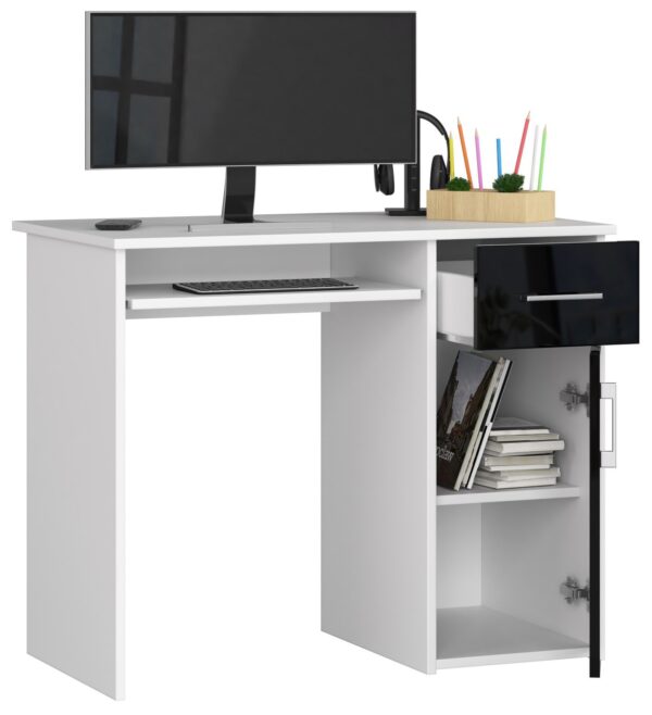 PIN kodo kompiuterio stalas yra puikus pasiūlymas kambaryje, biure ar biure. Šis baldas užtikrina maksimalų darbo ir mokymosi komfortą. Jo korpusas, baltas, o stalčių ir durelių fasadai yra blizgiai juodi. Jų rankenos yra sidabrinės spalvos. Tai elegantiškas, bet kartu ir dizainerių sukurtas sprendimas, puikiai tiks prie įvairių interjero derinių. Rašomasis stalas pagamintas iš trinčiai atsparios 16 mm laminuotos plokštės. Matomos briaunos padengtos ABS briauna, padidinta atsparumu pažeidimams. Šis baldas suteikia daug vietos bet kokiam išdėstymui. Jame yra stalčius, spintelė (ir viena lentyna viduje) ir išstumiama klaviatūros lentyna. Stalčius ir lentyna juda dėl metalinių ritinėlių kreiptuvų – šis mechanizmas užtikrina maksimalų komfortą naudojant baldus. Rašomasis stalas laisvai pastatomas, jis skirtas savarankiškai surinkti, o tai padeda su užsakymu pateiktos instrukcijos. Jam taip pat suteikiama 24 mėnesių garantija. Baldus galima įsigyti už labai patrauklią kainą. Jis pasižymi ilgaamžiškumu ir atsparumu, todėl tai yra daugelio metų investicija. Be to, vizualiai atrodo įdomiai ir padeda tinkamai organizuoti darbą. Jo matmenys yra 90 cm ilgio, 74 cm aukščio ir 50 cm gylio. – Pagamintas rašomasis stalas iš dilimui atsparios laminuotos plokštės – Yra daug vietos bet kokiam išdėstymui – Durelių viduje yra viena lentyna – Stalčių ir durų fasadai pagaminti iš akrilo MDF High Gloss – Stalčiai ir klaviatūros lentyna juda ant metalinių ritinėlių kreiptuvų – Matomi kraštai padengti ABS briauna, kad būtų didesnis atsparumas pažeidimams – Sidabrinės rankenos stalčiams ir durims – Rašomasis stalas savarankiškam surinkimui – Laisvai pastatomas rašomasis stalas (laminuota lenta stalo gale) – Pateikiamas vadovas – Garantija 24 mėn. Laisvai stovintį stalą galima pastatyti biure, viešbučio ar paslaugų patalpose. ABS briauna apsaugo stalo kraštus nuo pažeidimų. Nuostabus kainos ir kokybės santykis.