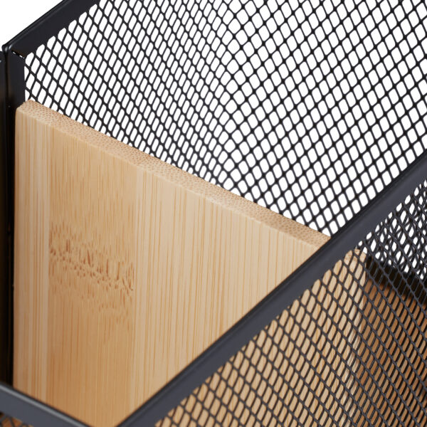 - Medžiagos: Pagamintas iš natūralaus bambuko ir juodo tinklelio, šis organizatorius yra ne tik patvarus, bet ir vizualiai įspūdingas.