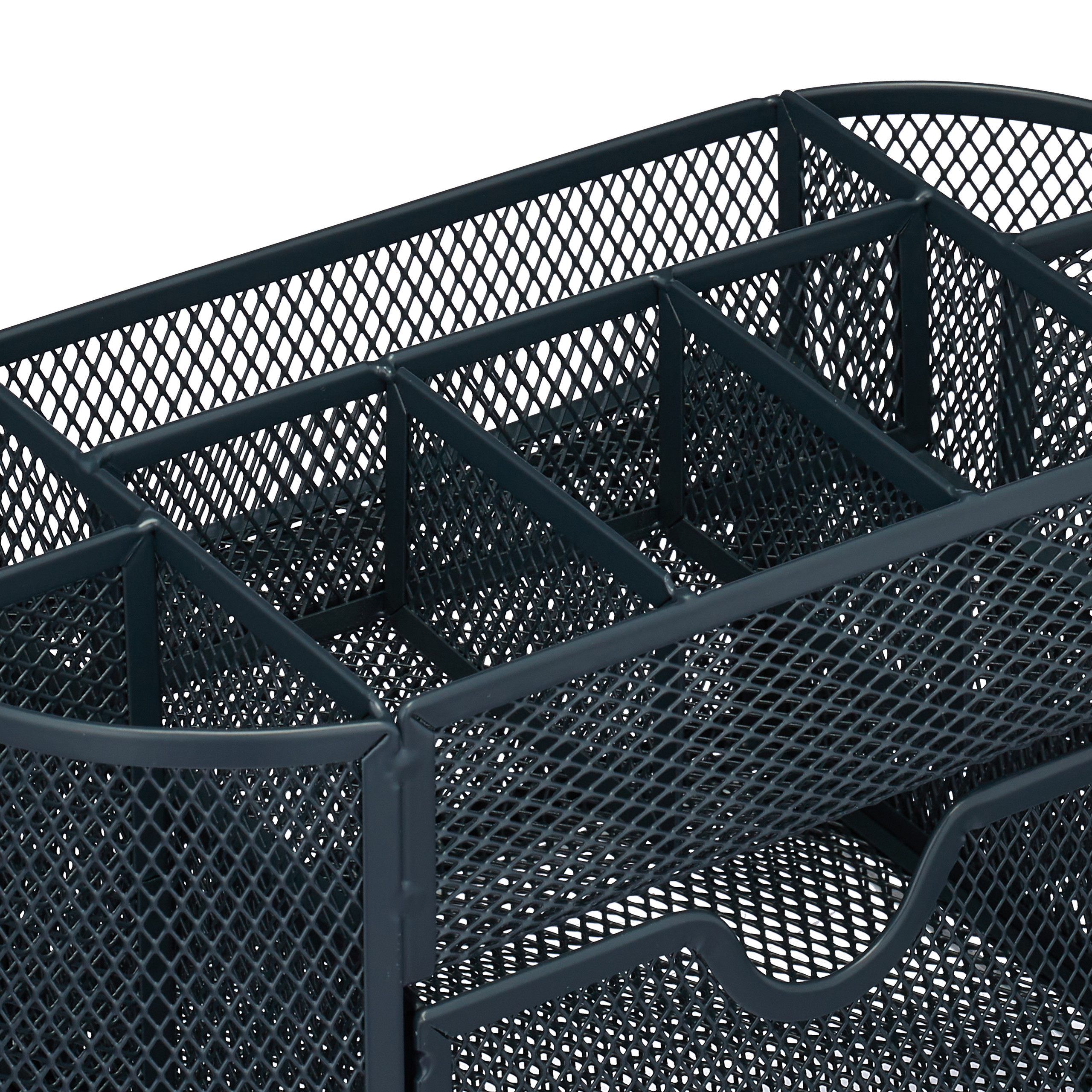 Įneškite tvarkos ir stiliaus į savo darbo erdvę su šiuo elegantišku rašymo priemonių organizatoriumi. Jo kompaktiškas dydis – 10,5x22x11 cm – puikiai tiks bet kurioje darbo vietoje, o tamsiai pilka spalva suteiks modernumo ir subtilumo.