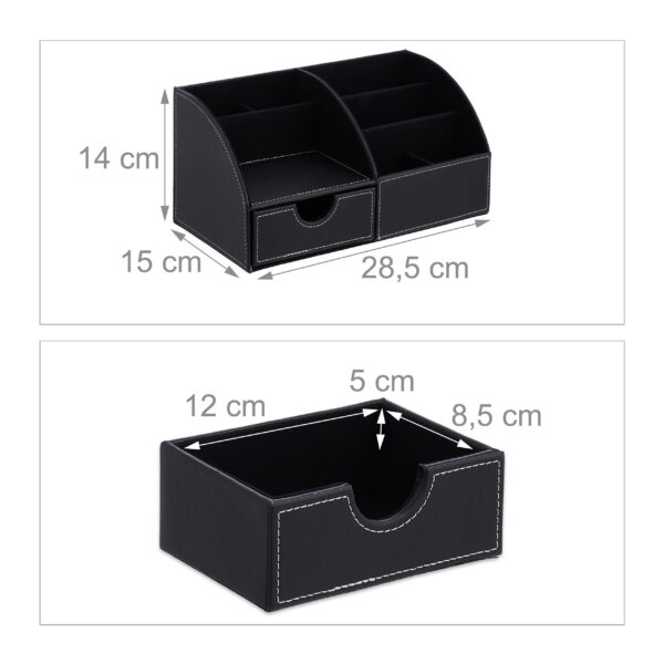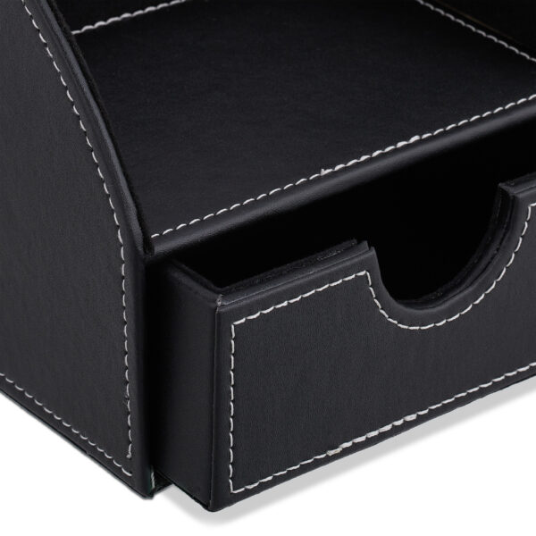 - Elegantiškas dizainas: Juoda spalva ir odinė išvaizda suteikia organizatoriui prabangos ir stiliaus, todėl jis tampa puikiu akcentu tiek biure, tiek namų darbo vietoje.