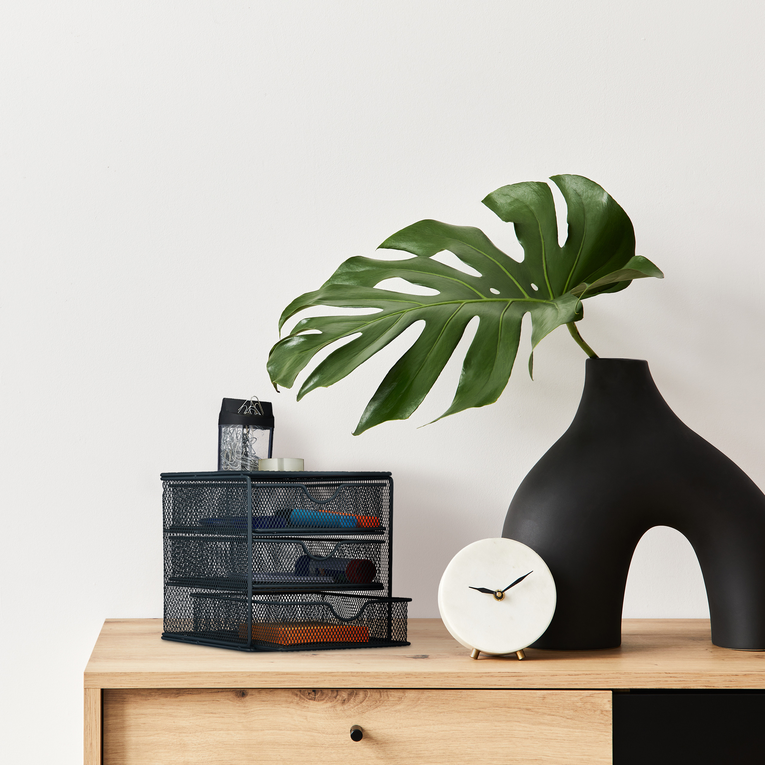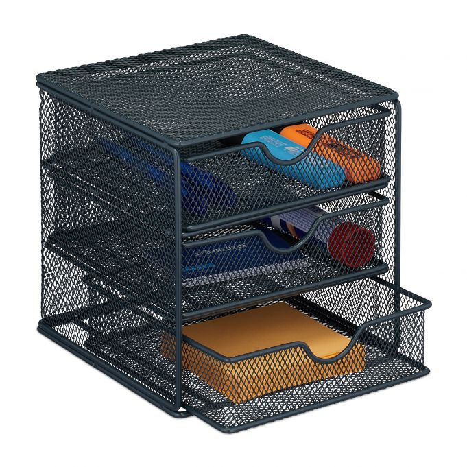 - 3 skyriai: Leidžia tvarkingai laikyti įvairius biuro reikmenis, tokius kaip sąvaržėlės, užrašai, rašikliai, trintukai ir lipnios juostos.