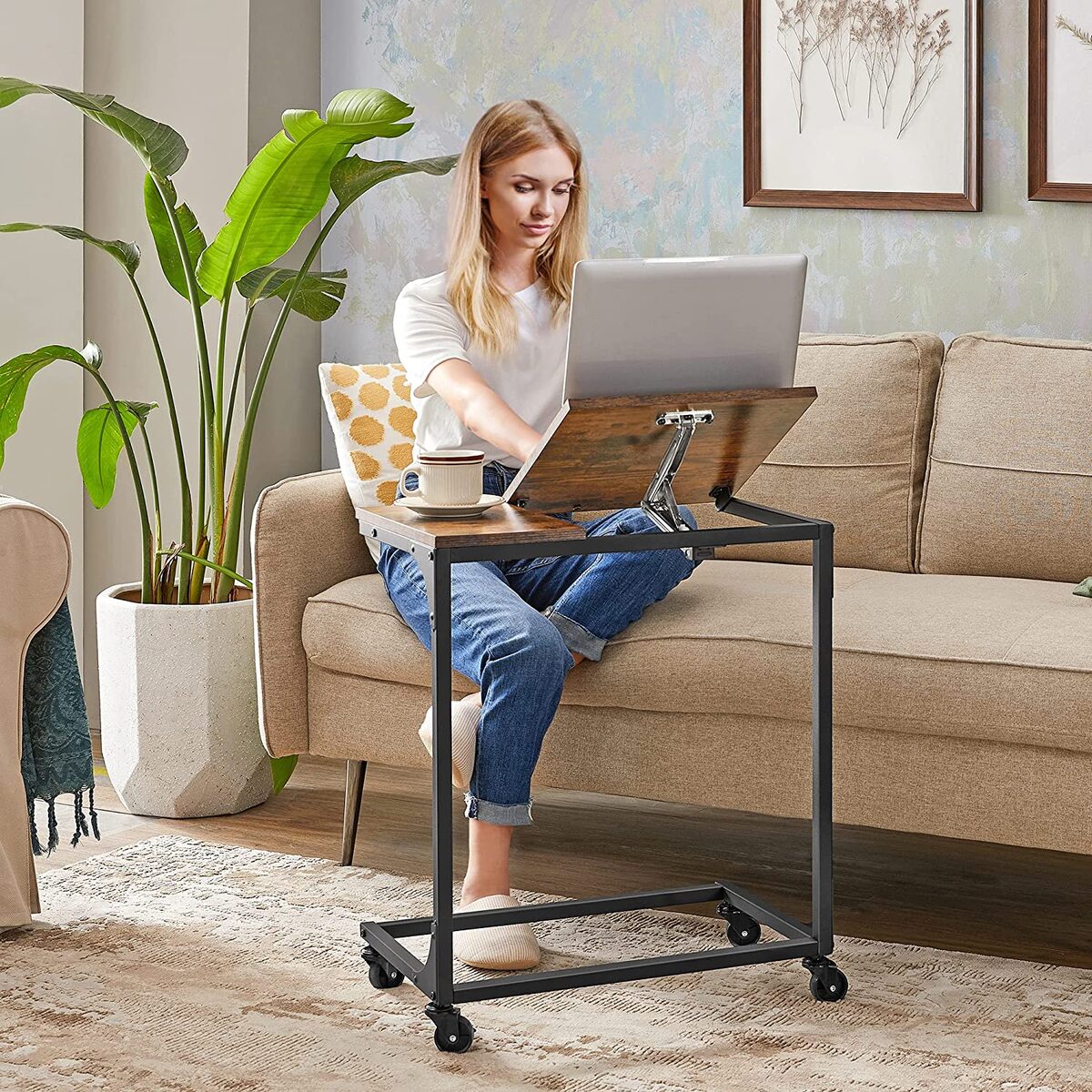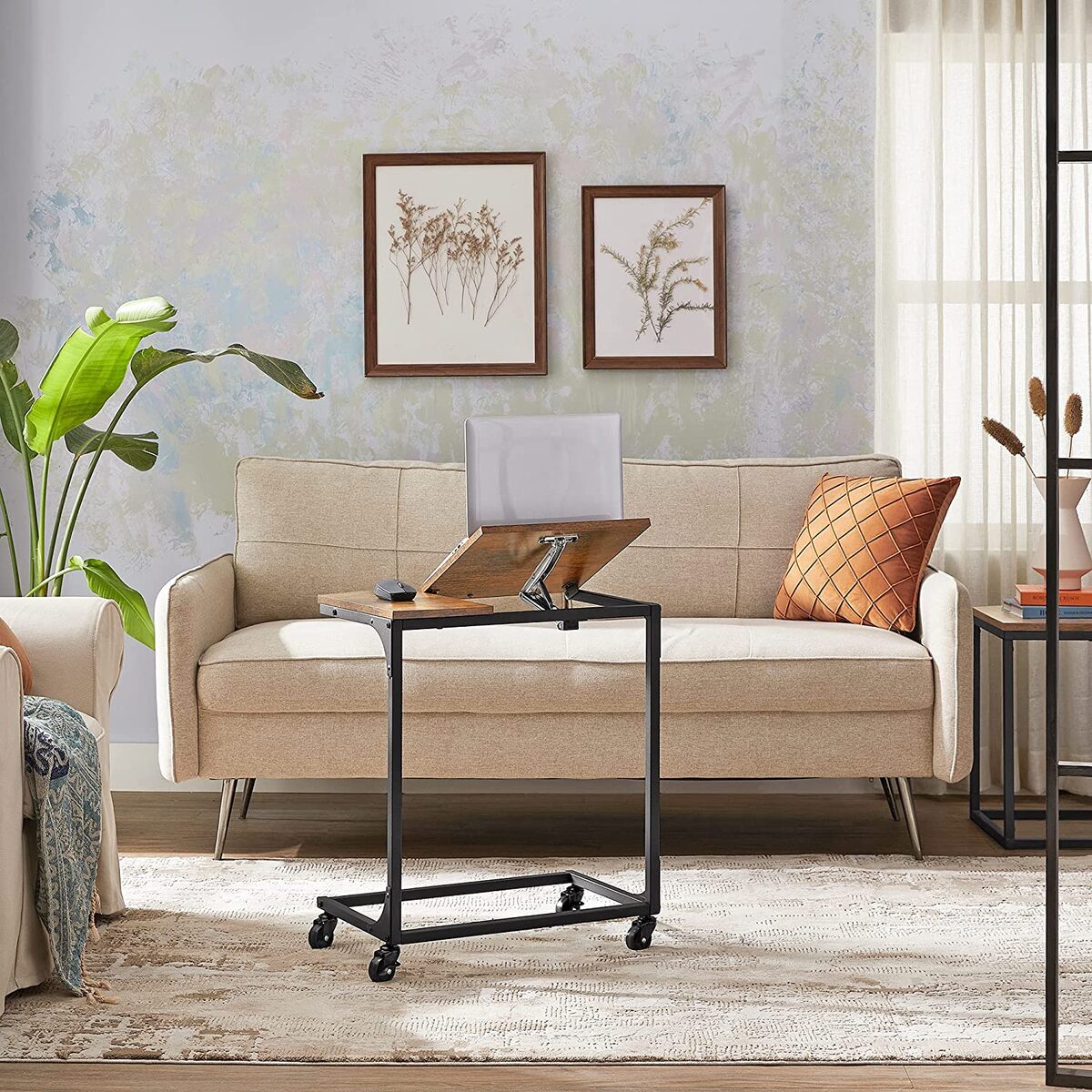 Reguliuojamas nešiojamojo kompiuterio staliukas ant ratukų, juodos/rudos spalvos, yra puikus sprendimas tiems, kurie ieško funkcionalumo ir stiliaus derinio. Šis staliukas leidžia patogiai dirbti tiek sėdint, tiek stovint, todėl galite lengvai keisti darbo poziciją ir išvengti ilgalaikio sėdėjimo sukeltų sveikatos problemų.