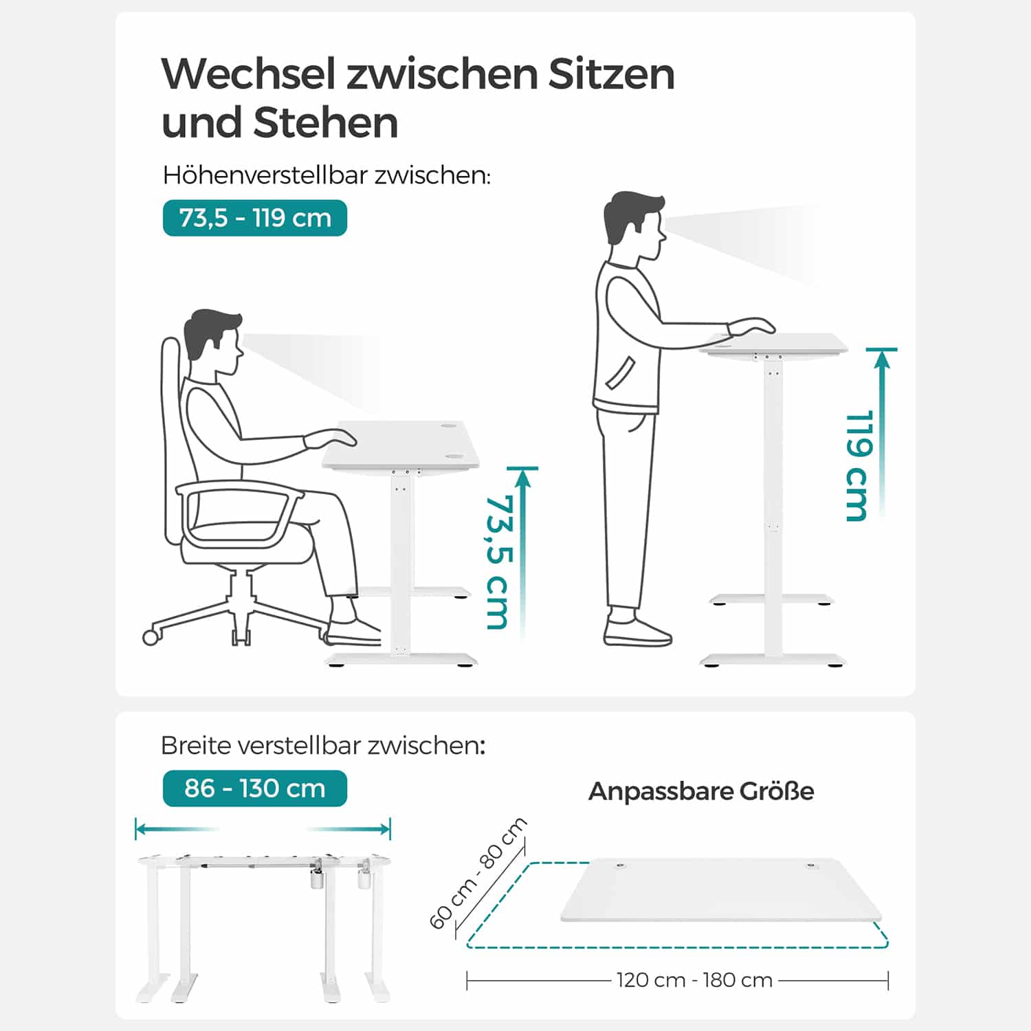 Stalo aukštis gali būti reguliuojamas nuo 72 cm iki 120 cm, užtikrinant patogią laikyseną ir prisitaikant prie individualių poreikių. Elektrinė aukščio reguliavimo sistema yra intuityvi ir lengvai naudojama, leidžianti greitai ir sklandžiai keisti stalo aukštį.