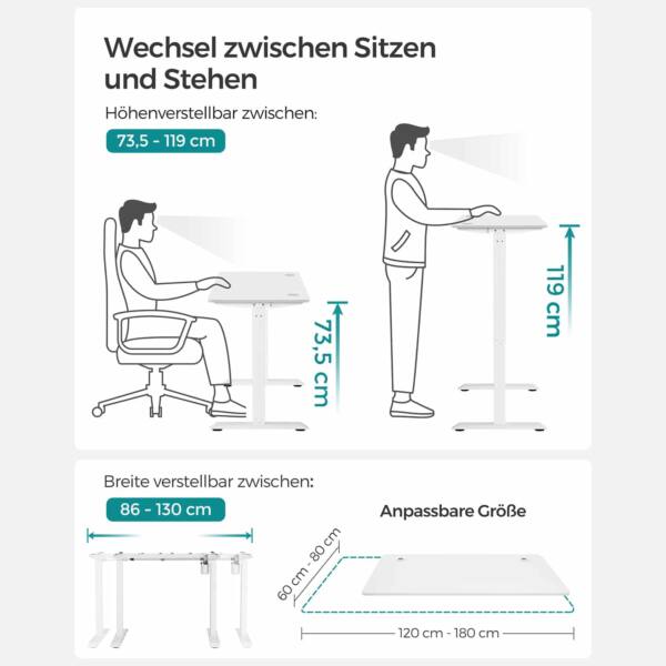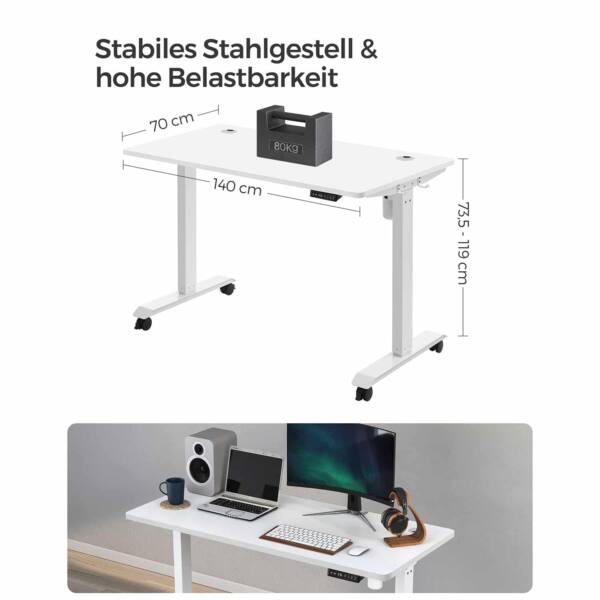 Reguliuojamo aukščio elektrinis stalas su atminties funkcija 70 x 140 cm, baltos spalvos, suteikia galimybę lengvai keisti darbo poziciją nuo sėdimos iki stovimos. Tai padeda išlaikyti sveiką laikyseną ir sumažinti nugaros bei kaklo įtampą.