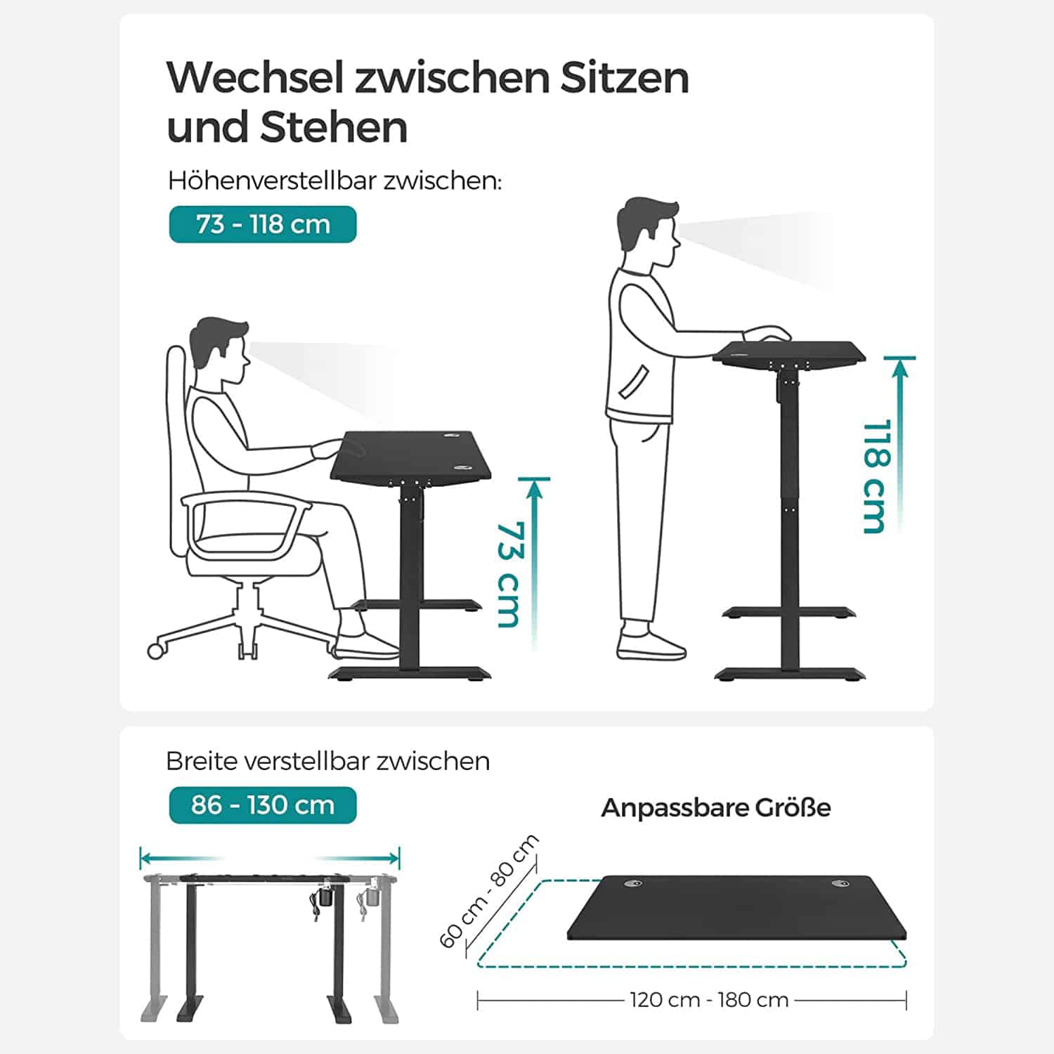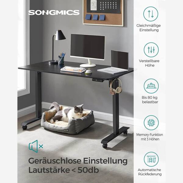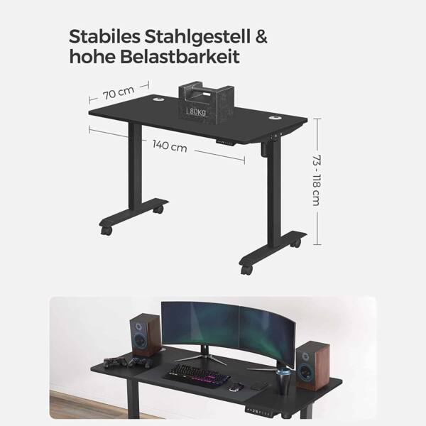 Reguliuojamo aukščio elektrinis stalas su atminties funkcija 70 x 140 cm, juodos spalvos, suteikia galimybę lengvai keisti darbo pozicijas nuo sėdimos iki stovimos. Tai padeda išlaikyti sveiką laikyseną ir sumažinti nugaros bei kaklo įtampą.