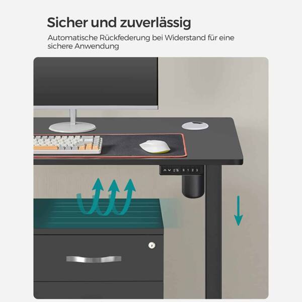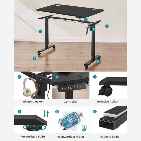 Kokybiškas variklis leidžia tolygiai reguliuoti aukštį, o stalas yra pagamintas iš tvirtos medienos drožlių plokštės ir plieno, užtikrinant ilgaamžiškumą ir stabilumą.