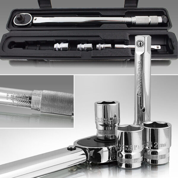 Pramoninės kokybės sukimo momento veržliaraktis, kad būtų lengva valdyti. Puikiai tinka dirbtuvėms. Svarbioms sraigtinėms jungtims reikia tam tikro priveržimo momento. Su šiuo dinamometriniu veržliarakčiu, pagamintu iš aukštos kokybės chromo vanadžio plieno, puikus varžtų atsukimas ir priveržimas garantuoja reguliuojamą sukimo momentą. Rinkinys supakuotas į patogų lagaminą. ; Komplekte yra papildomos 17, 19, 21 mm ratų veržlės su apsauginiu ratlankiu, kurios idealiai tinka keisti ratus nepažeidžiant ratlankių. Riešutai supakuoti į praktišką dėžutę. ; Veržliarakčio techninės specifikacijos: ilgis: 46 cm, kotas: 1/2 „, reguliavimo diapazonas: 28–210 Nm, svorio rinkinys: 2,10 kg, medžiaga: chromo vanadžio plienas. ; Techninė specifikacija veržlės: Medžiaga: chromo vanadžio plienas, Rėmas: 1/2 „, dydžiai: 17, 19 ir 21 mm. ; Komplekte: 1x sukimo momento veržliaraktis, 3x veržlės (17, 19, 21 mm), 1x 1/2” 125 mm ilgintuvas, apverčiamas, kairėje ir dešinėje, sukimo momento reguliavimas. : 3x veržlės su apsauginiu ratlankiu – 17, 19, 21 mm ;