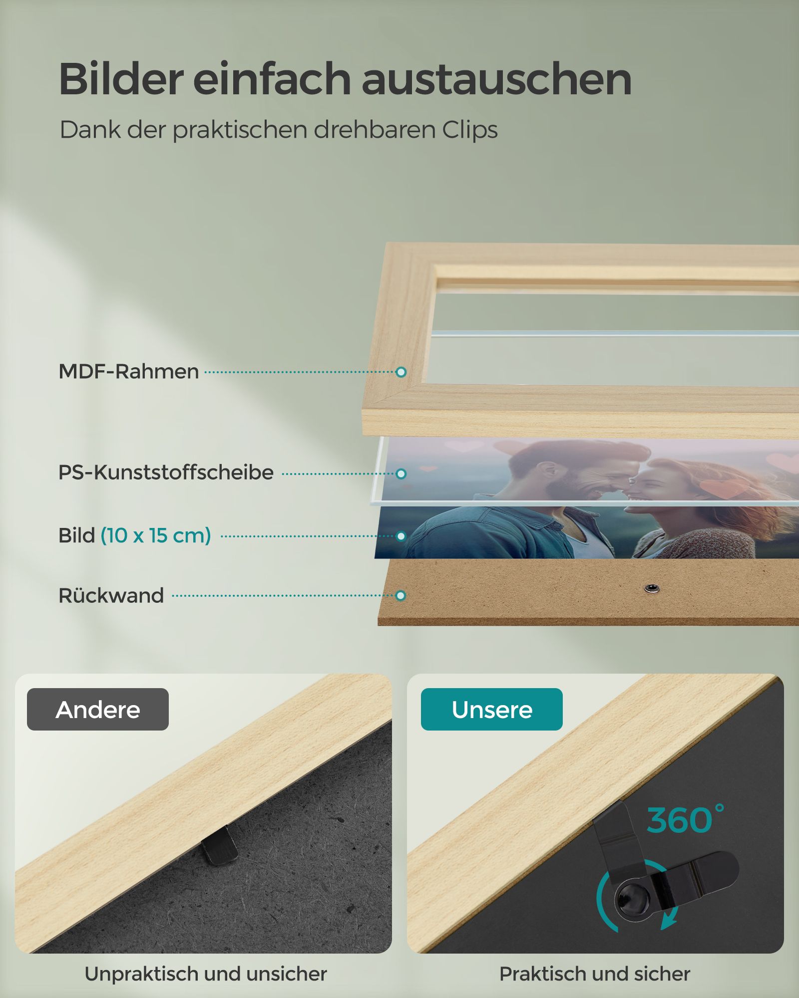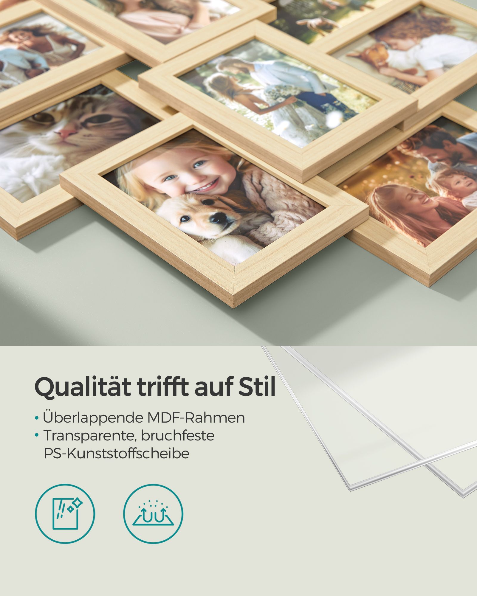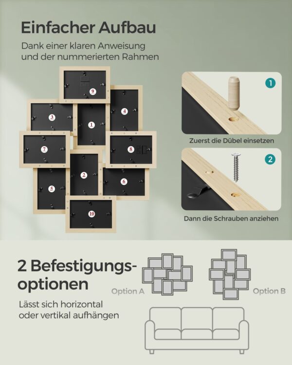 - Tinkami nuotraukų dydžiai: Rėmeliai pritaikyti 10 x 15 cm dydžio nuotraukoms, leidžiantys sukurti harmoningą koliažą.