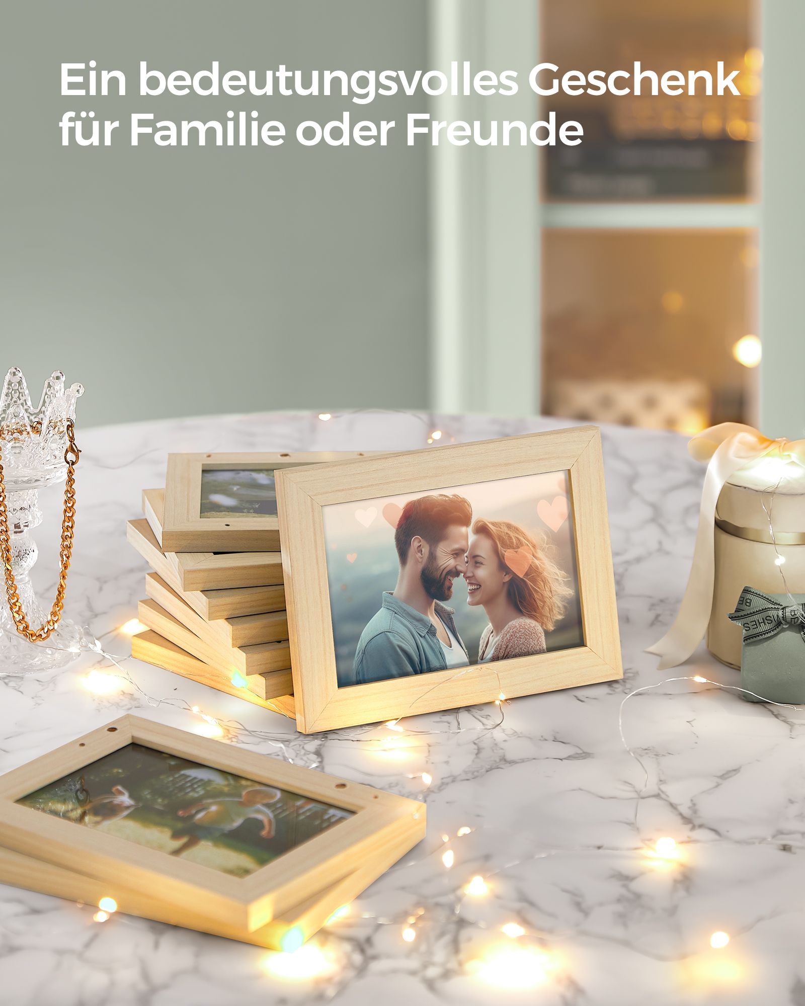 Įamžinkite savo brangiausias akimirkas su šiuo elegantišku ir funkcionaliu nuotraukų rėmelių rinkiniu. Šis rinkinys, sudarytas iš 10 rėmelių, puikiai tiks tiek moderniam, tiek klasikiniam interjerui, suteikdamas jūsų namams jaukumo ir stiliaus.