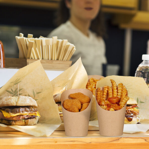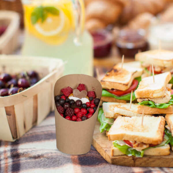 Pagaminti iš tvirto kraftpopieriaus, šie indeliai yra ne tik estetiški, bet ir praktiški. Vidinis padengimas užtikrina, kad jie būtų atsparūs drėgmei, o suapvalintas priekis leidžia lengvai prieiti prie turinio ir jį dekoruoti.