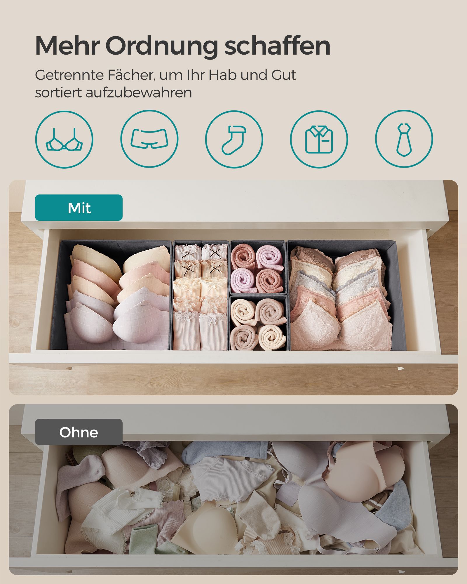 Šis rinkinys puikiai tinka tiek mažoms, tiek didelėms spintoms, suteikdamas galimybę optimaliai išnaudoti erdvę. Dėžės pagamintos iš tvirto kartono ir padengtos kokybišku neaustiniu audiniu, todėl jos yra patvarios ir ilgaamžės. Pasirinkite šį rinkinį ir mėgaukitės tvarkinga bei stilinga aplinka kiekvieną dieną.