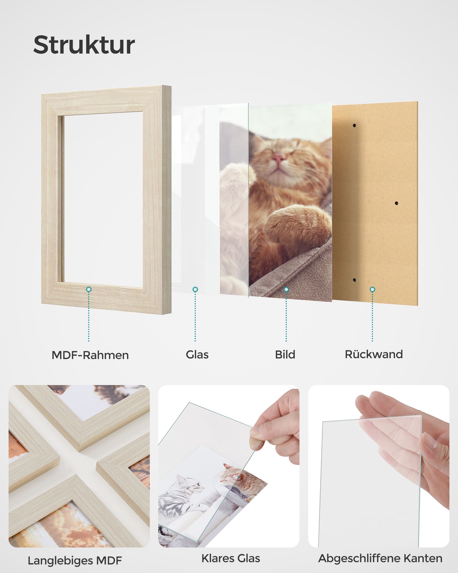 - Medžiaga: MDF (Medium Density Fiberboard) rėmas, stiklo plokštė