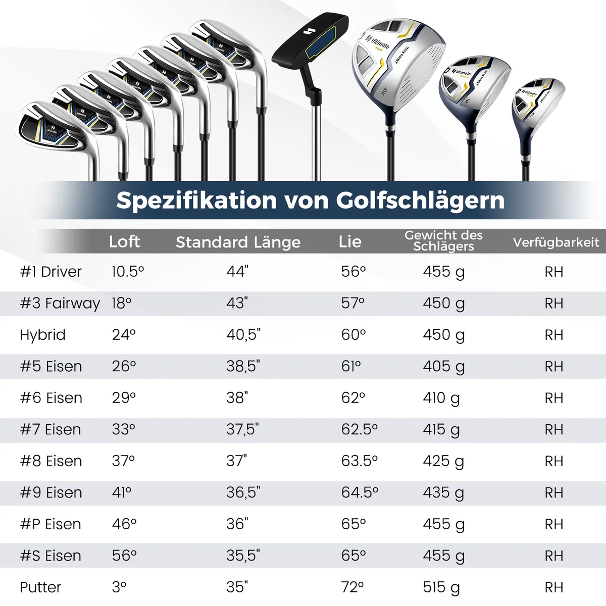 - 15 dalių vyrų golfo rinkinys su 1 vairuotoju, 3 farvaterio mediena, hibridu, 7 lygintuvais (#5, #6, #7, #8, #9, #P, #S), plaktiku ir stovo krepšiu su apsauga nuo lietaus.
