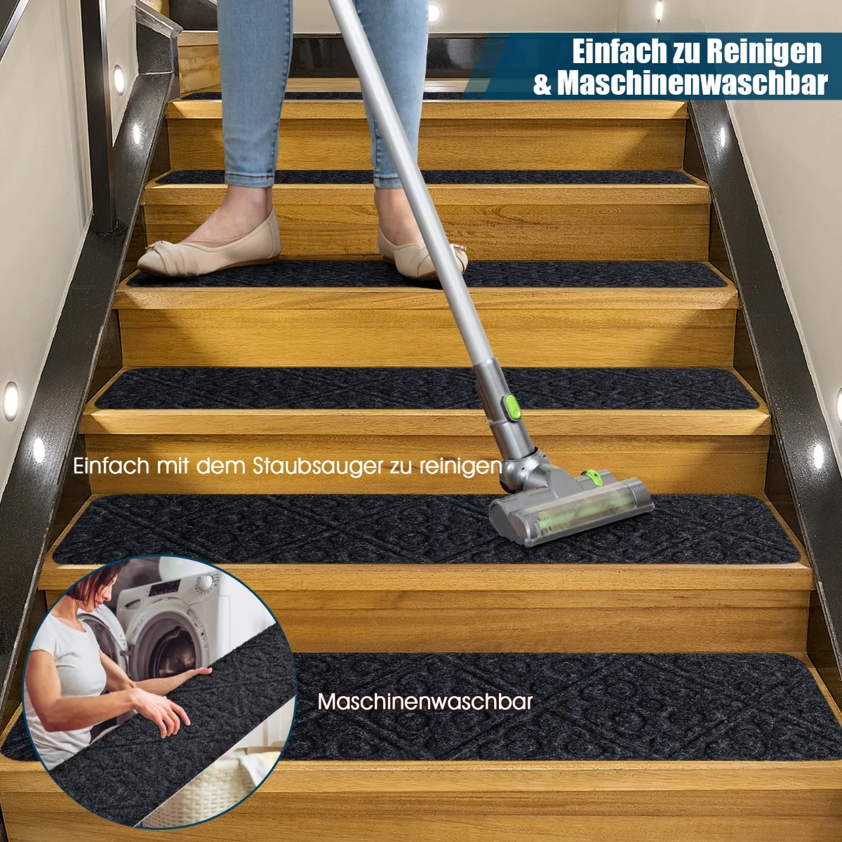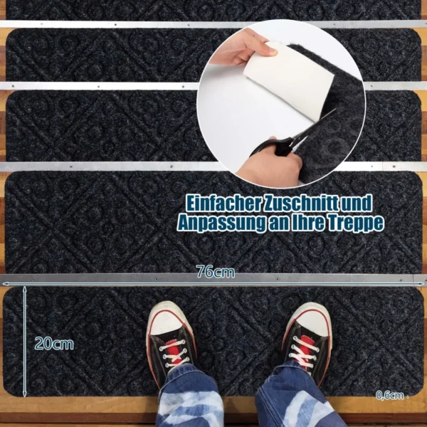 Rinkinys iš 15 neslystančių laiptų kilimėlių 76×20 cm, tamsiai pilkos spalvos, skirtas saugiam judėjimui laiptais. Kilimėliai pagaminti iš patvaraus poliesterio, atsparaus vandeniui ir lengvai prižiūrimi.