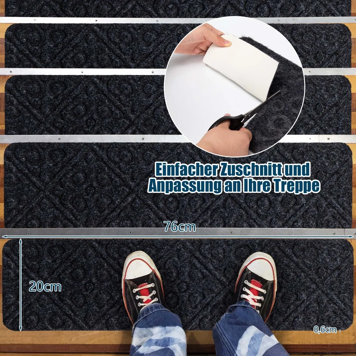 • 15 x laiptų kilimėliai, tamsiai pilkos spalvos, kiekvieno dydis 76 x 20 cm