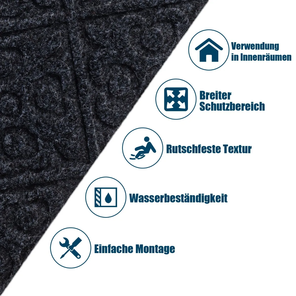 • Keturių sluoksnių konstrukcija: vandeniui atsparus poliesteris, buferinis sluoksnis, neslidi PVC dalis ir apsauginė plėvelė.