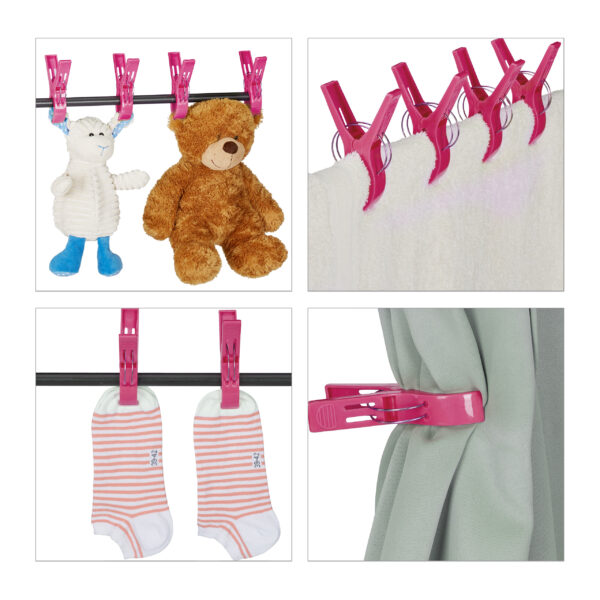 - Universalumas: Puikiai tinka paplūdimio rankšluosčiams, vonios rankšluosčiams, drabužiams ir kitiems daiktams tvirtinti.