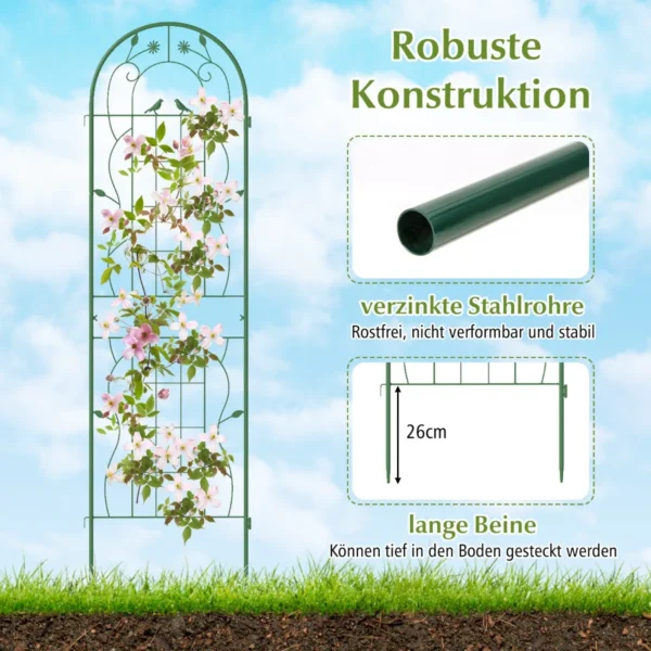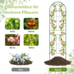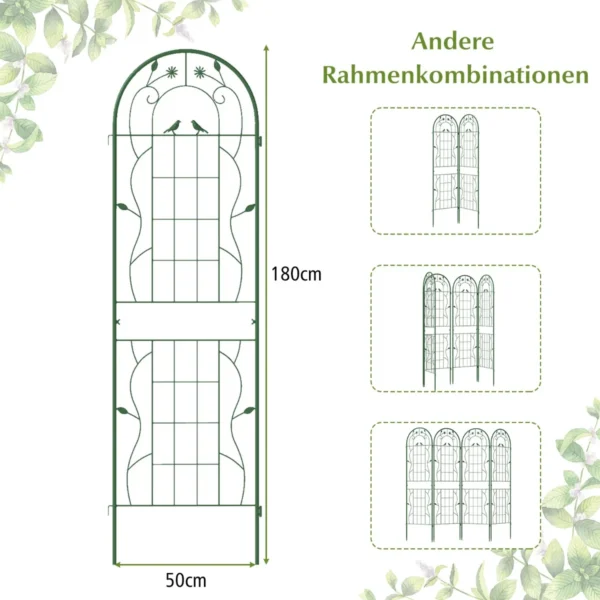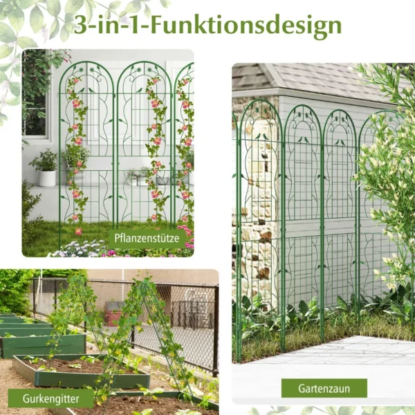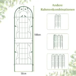 Rinkinys iš 2 augalų grotelių 180×50 cm žalios spalvos yra puiki vertikali augalų atrama sode ar kieme. Metalinės grotelės suteikia pakankamai vietos vijokliniams augalams, tokiems kaip agurkai, vynuogės, žirniai ar pomidorai, augti ir formuotis. Grotelės taip pat gali atlikti sodo tvoros funkciją, apsaugant augalus nuo gyvūnų.