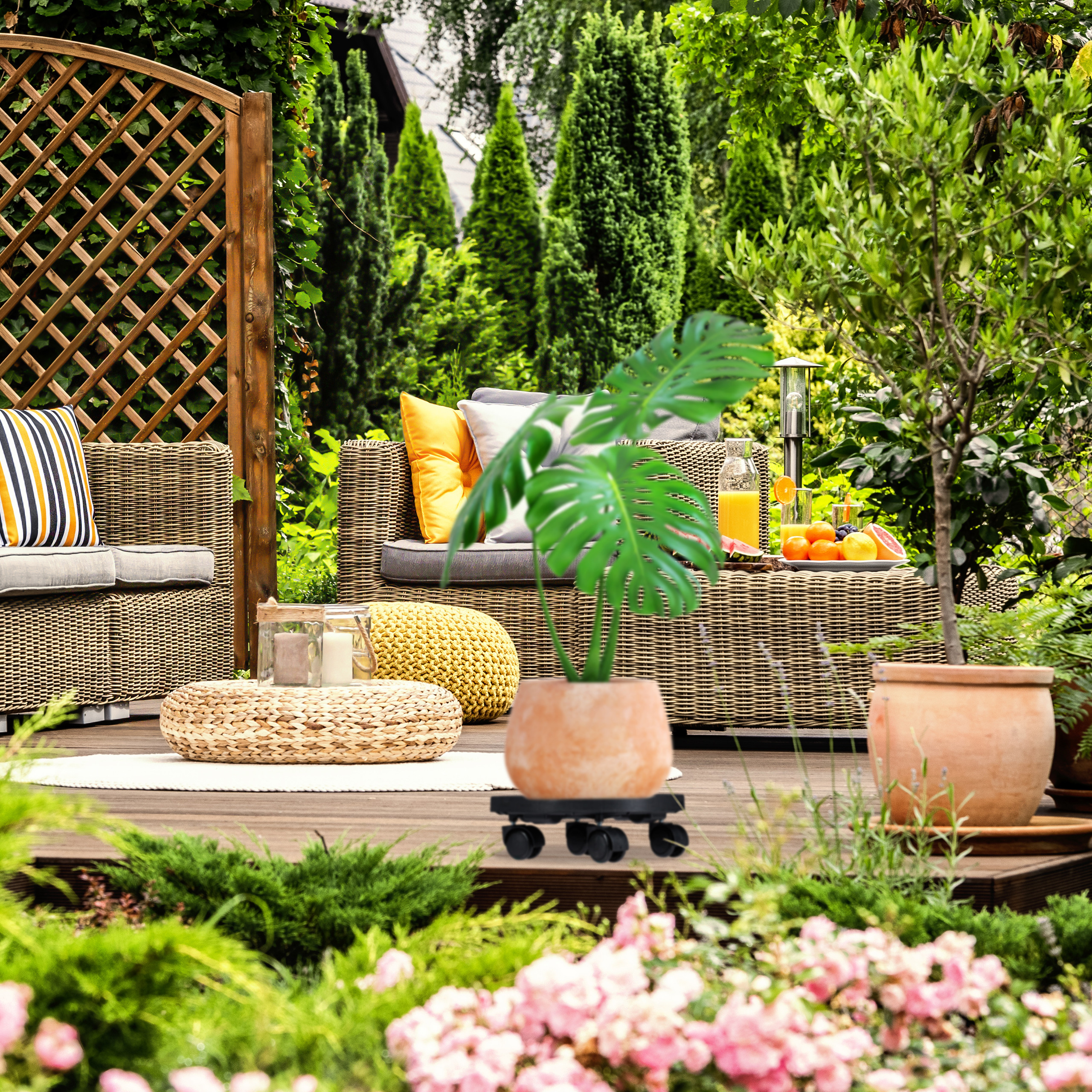 - Mobilumas: Ratukai leidžia lengvai perkelti augalus be didelių pastangų.