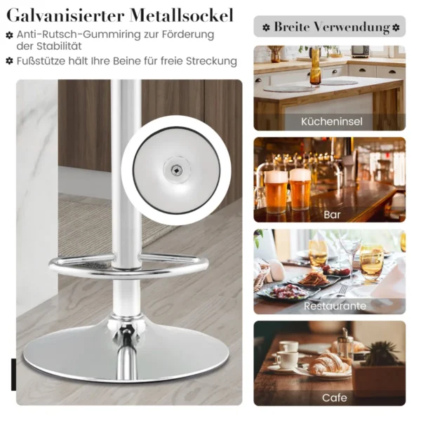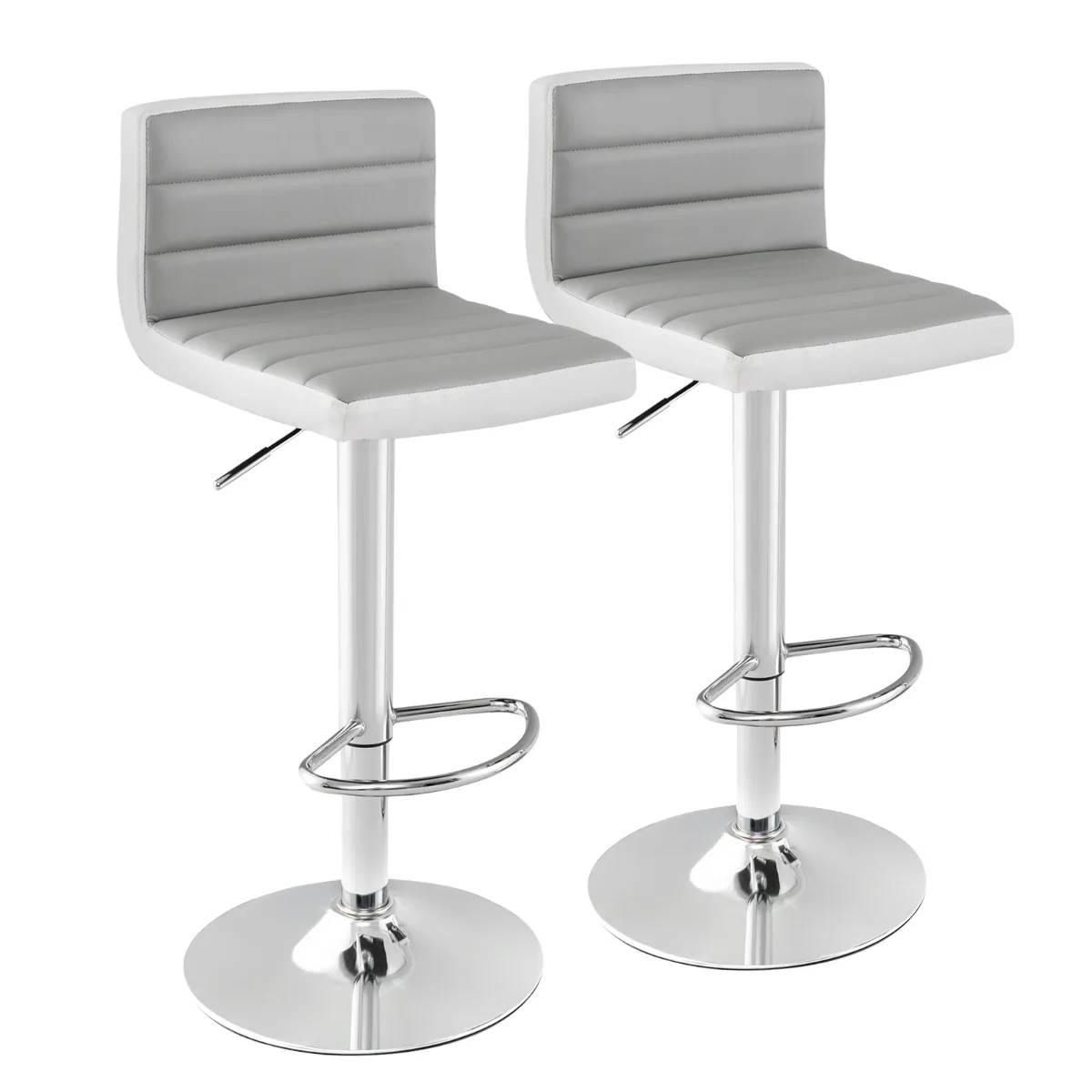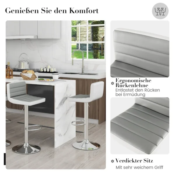 Rinkinys iš 2 baro kėdžių baltos ir pilkos spalvos puikiai tinka virtuvės salai, barui ar kavinės erdvei. Kėdės pasižymi reguliuojamu aukščiu ir pasukamu dizainu, užtikrinančiu patogumą sėdint įvairiose situacijose. Pagamintos iš patvarių medžiagų, jos atlaiko iki 150 kg apkrovą.