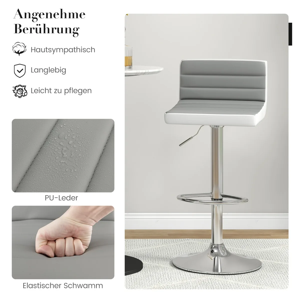 - Baro kėdės pagamintos iš PU odos, atsparios dilimui, blukimui ir vandeniui.